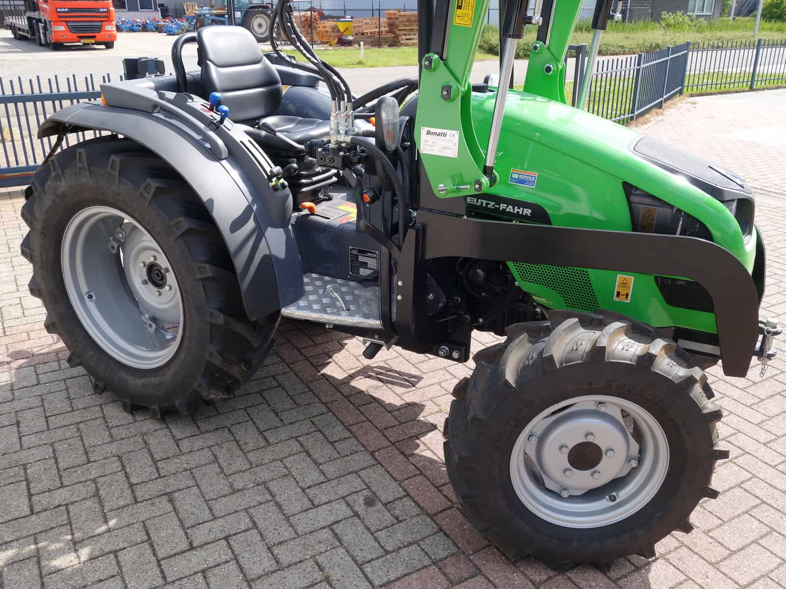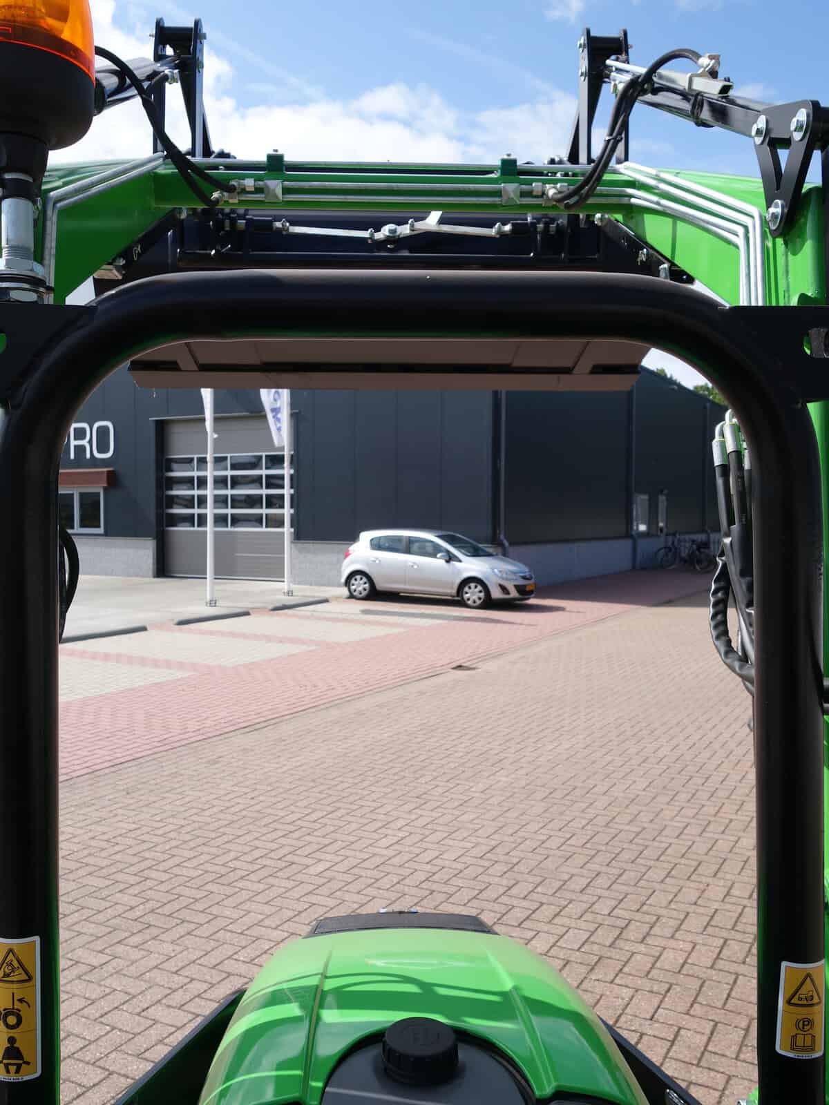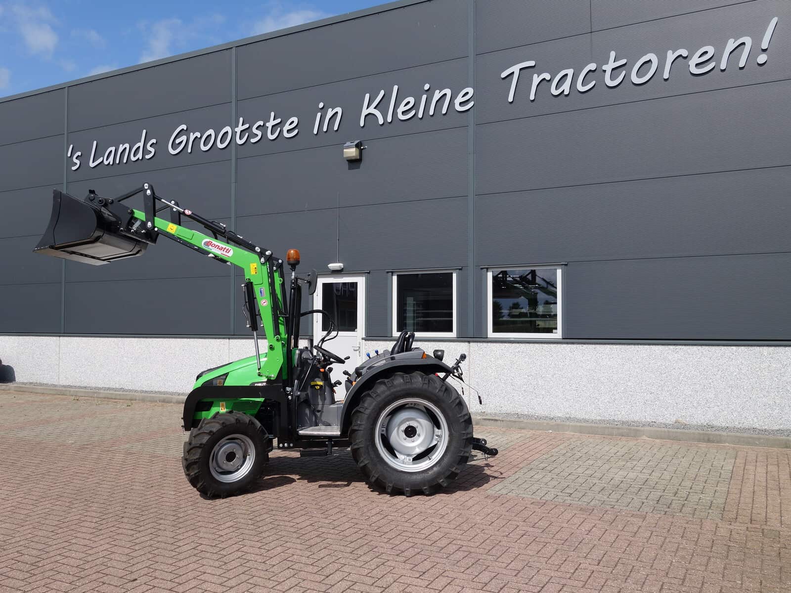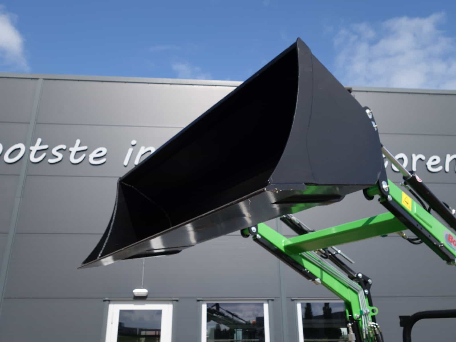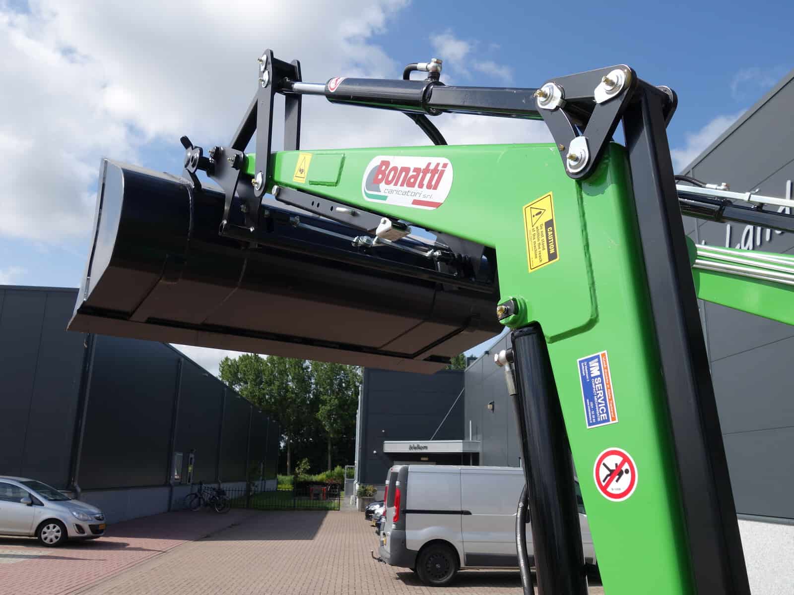 En dan hebben we natuurlijk nog de nieuwe Bonatti voorlader. Ook weer in de meest luxe uitvoering, te weten; Dubbelwerkend systeem (zowel hefkracht als duwkracht), Parallelgeleiding (de bak gaat in dezelfde stand mee omhoog), Snelwisselsysteem op de aanbouwwerktuigen (met een handle zijn de aanbouwdelen eenvoudig te verwisselen), Snelwisselsysteem op de gehele voorlader (de voorlader kan in zijn geheel eenvoudig afgekoppeld worden).
