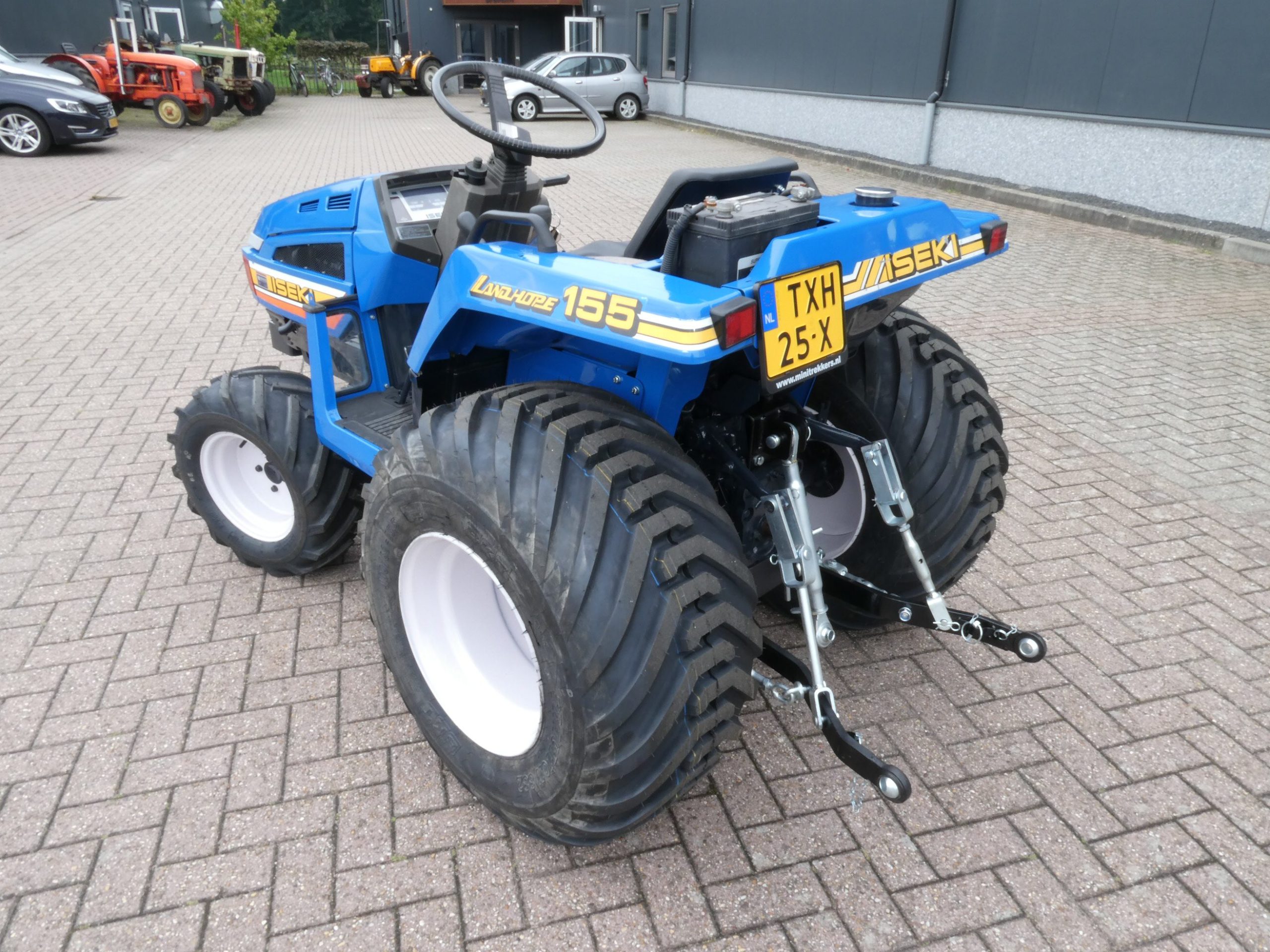 Aan de voorzijde zijn de nieuwe brede laag V-Profiel banden gemonteerd op de nieuwe velgen. Nauwelijks insporing, en toch maximale tractie als 4wd band. Deze prachtige set banden zijn gemonteerd op een 18 Pk sterke Iseki TU155 4wd. 3 cilinder dieselmotor, ZIJSCHAKELING, hef en aftakas aan de achterzijde, geheel klaargemaakt en klaar voor gebruik. Supernette en goede trekker, geleverd met garantie.