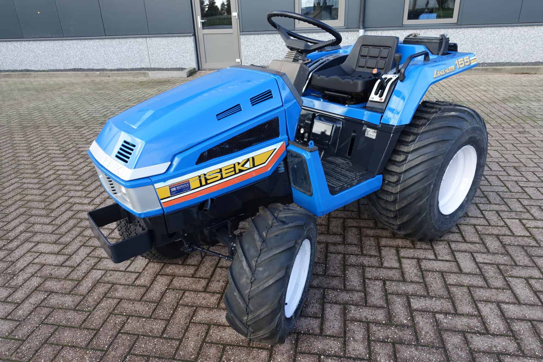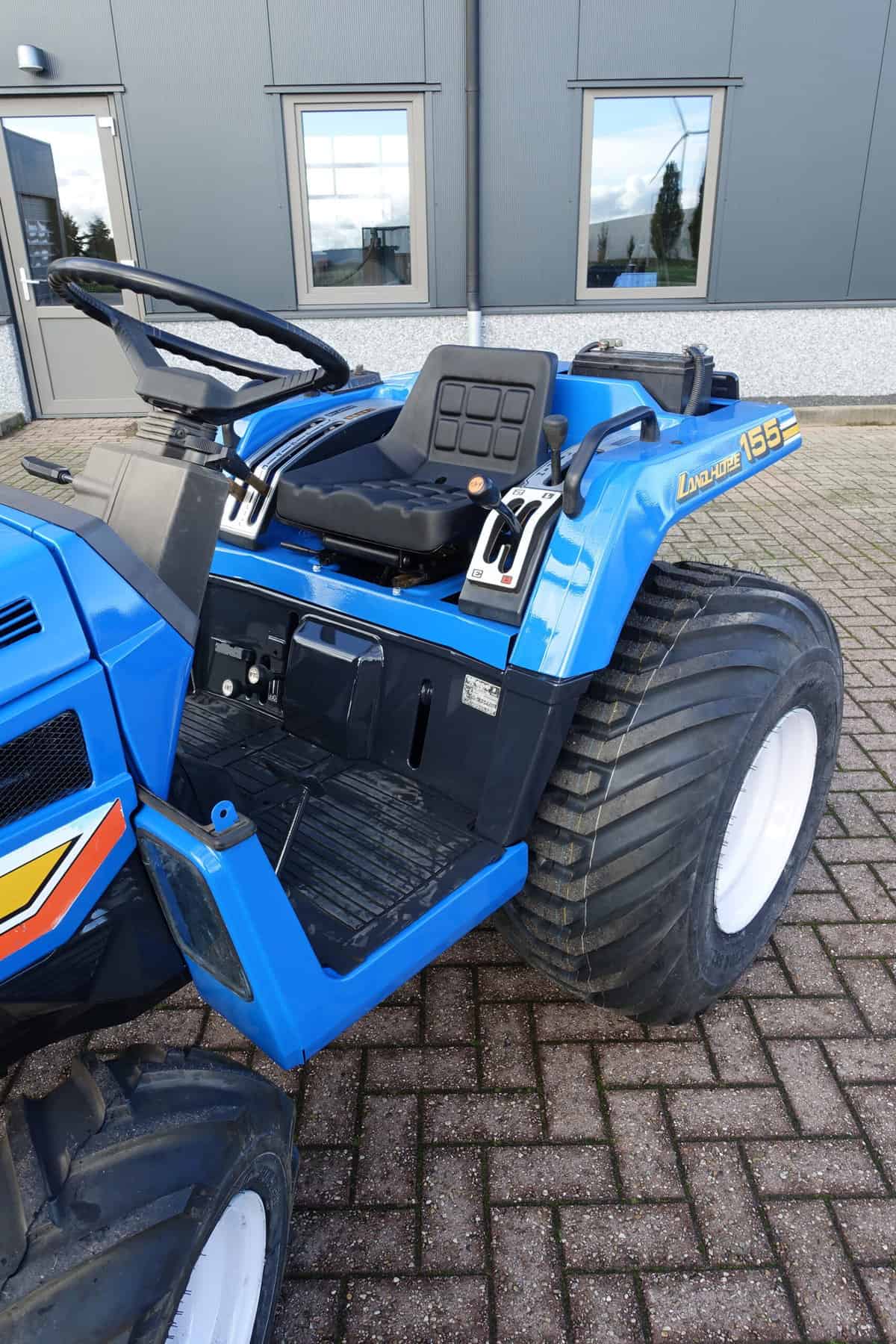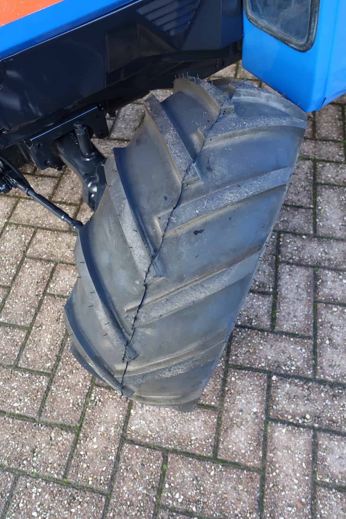 Aan de voorzijde zijn de nieuwe brede (afgeronde) grasband (rechts) gemonteerd op de nieuwe velgen. Nauwelijks insporing, geen snijranden in de bochten en toch (waar nodig) inzetbaar als 4wd band. Tevens hebben we deze brede band ook met een (laag) V-profiel (links). Dit geeft geen meerprijs. Deze prachtige set banden zijn gemonteerd op een 18 Pk sterke Iseki TU155 4wd. 3 cilinder dieselmotor, ZIJSCHAKELING, hef en aftakas aan de achterzijde, geheel klaargemaakt en klaar voor gebruik. Supernette en goede trekker, geleverd met garantie.