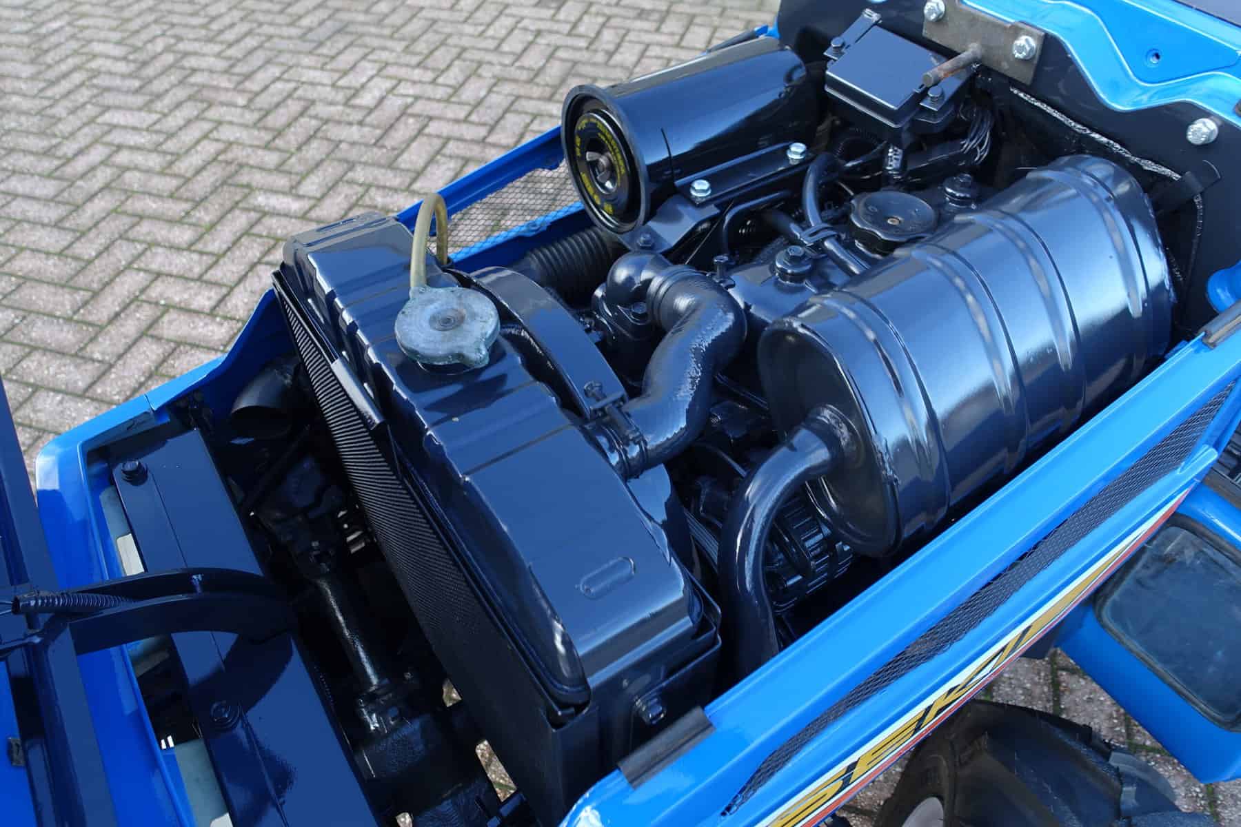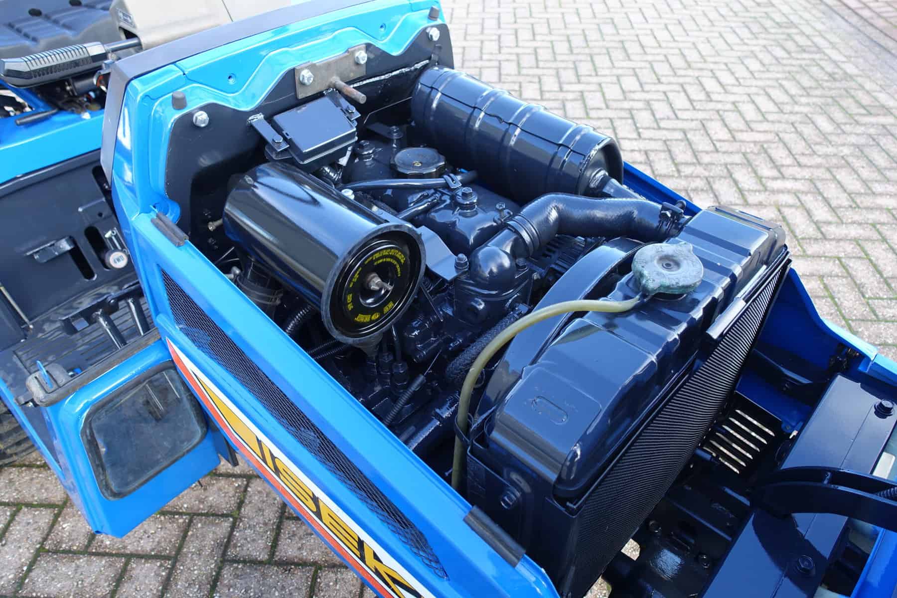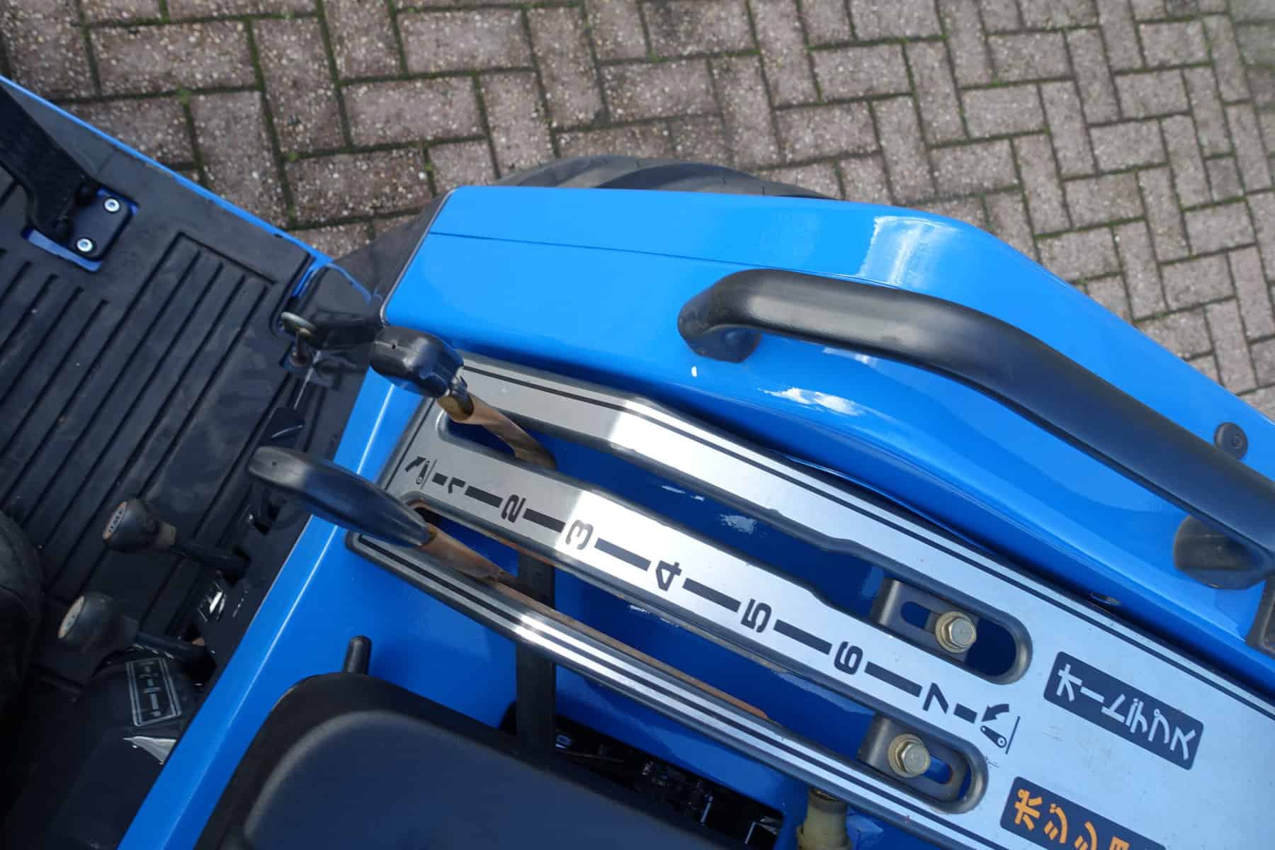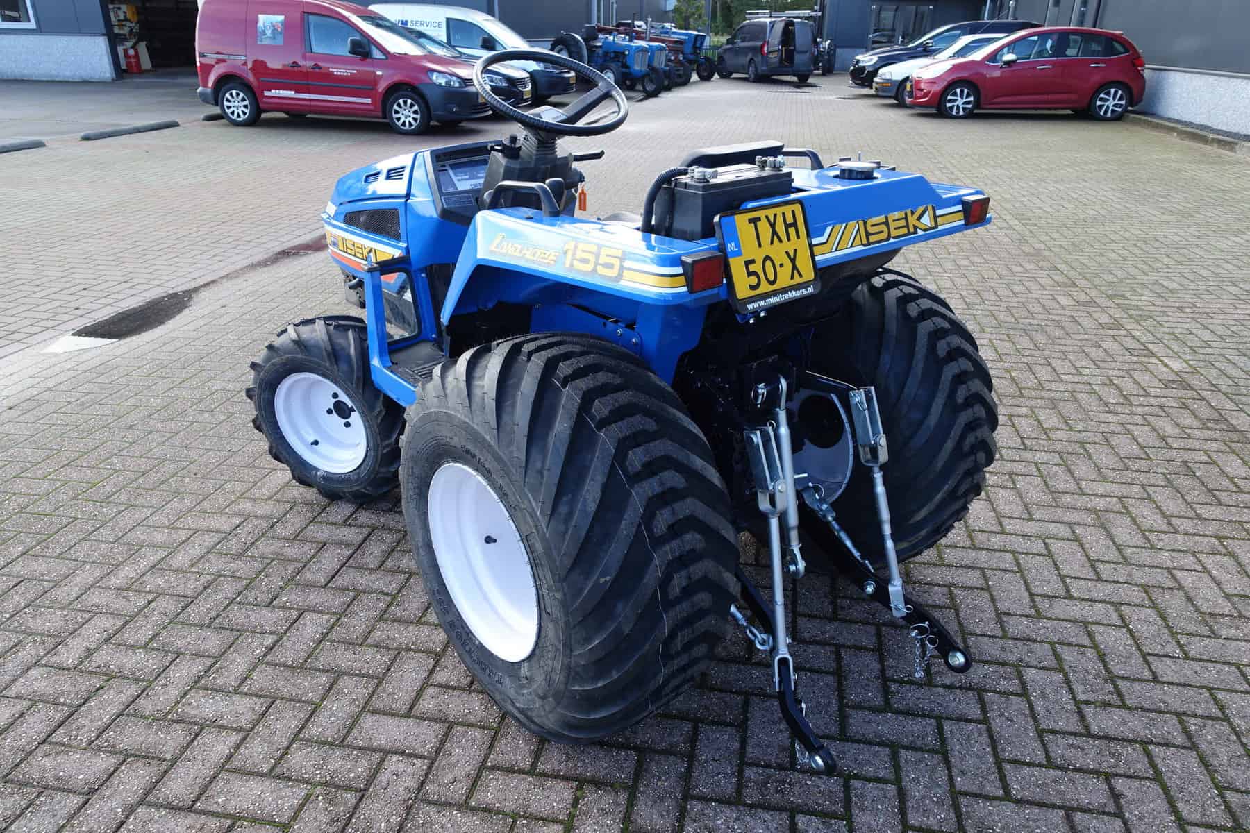 Aan de voorzijde zijn de nieuwe brede (afgeronde) grasband (rechts) gemonteerd op de nieuwe velgen. Nauwelijks insporing, geen snijranden in de bochten en toch (waar nodig) inzetbaar als 4wd band. Tevens hebben we deze brede band ook met een (laag) V-profiel (links). Dit geeft geen meerprijs. Deze prachtige set banden zijn gemonteerd op een 18 Pk sterke Iseki TU155 4wd. 3 cilinder dieselmotor, ZIJSCHAKELING, hef en aftakas aan de achterzijde, geheel klaargemaakt en klaar voor gebruik. Supernette en goede trekker, geleverd met garantie.
