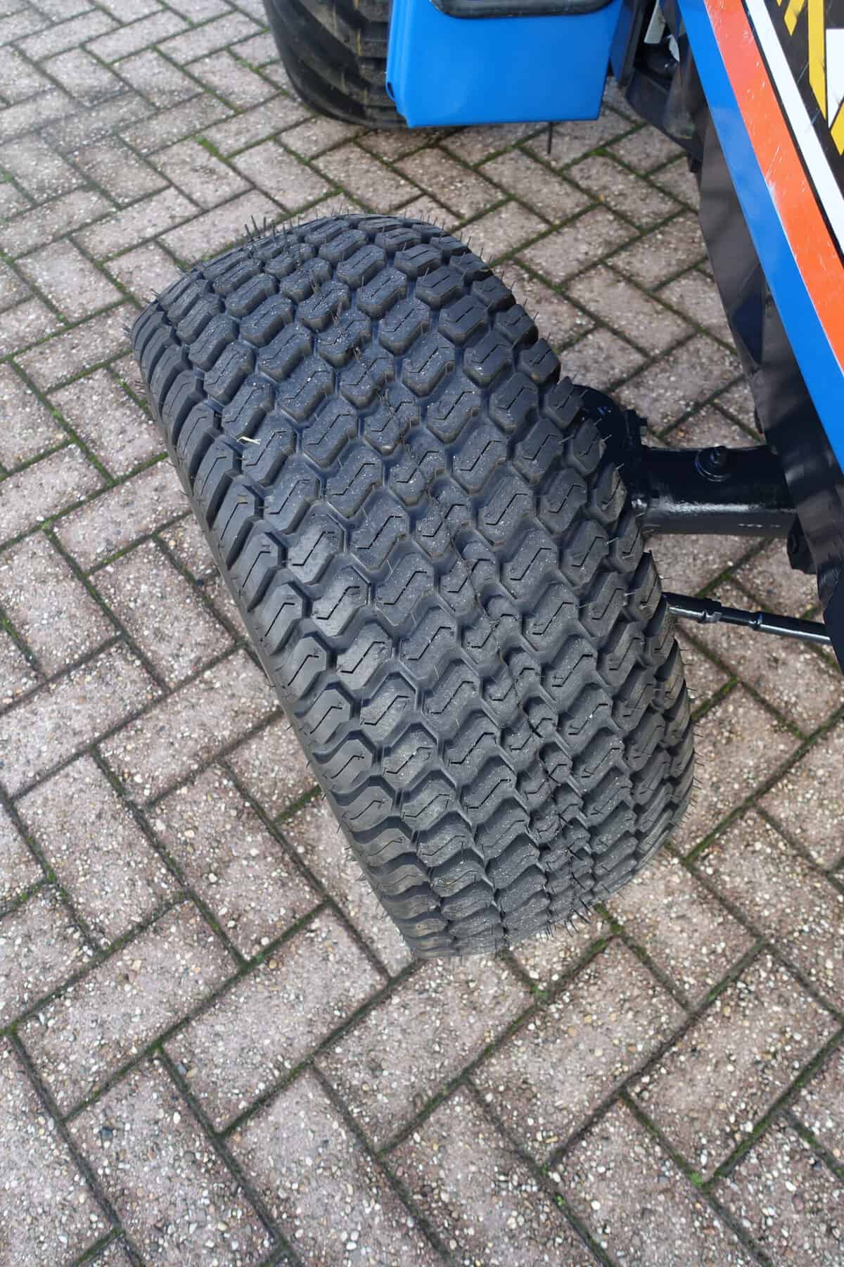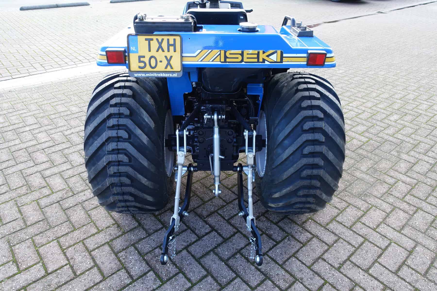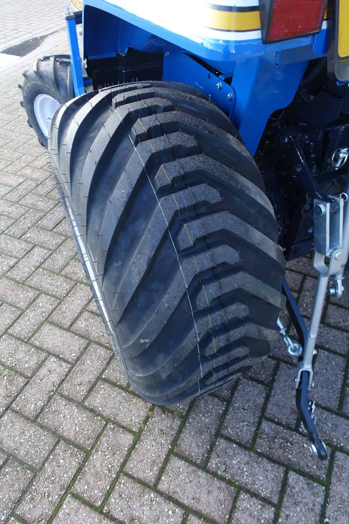 Aan de achterzijde voorzien van nieuwe velgen en nieuwe tractiebanden, mooie afgeronde nok waardoor een afgeronde band ontstaat, hierdoor snijdt de band minimaal in de ondergrond zodat je nauwelijks ziet waar je hebt gereden. Door de open nokken behoudt deze band toch de goede tractie. Door de breedte van de band wordt de druk goed verdeeld en is er nauwelijks insporing. Een ideale combinatieband dus, weinig insporing en toch goede tractie!