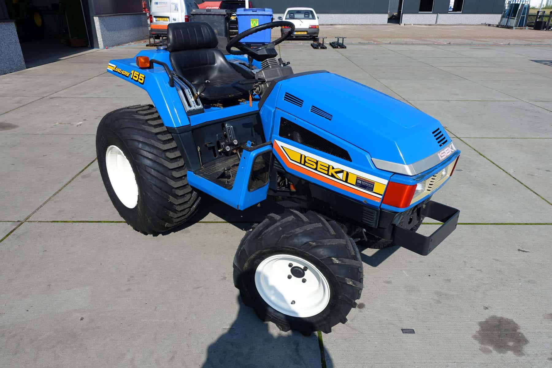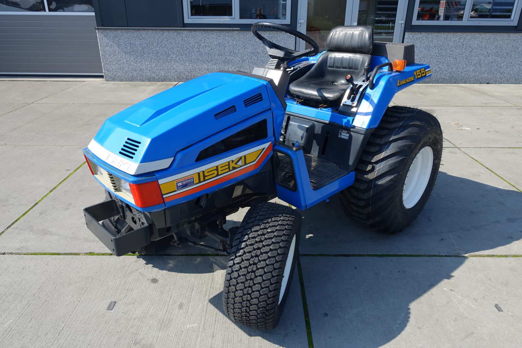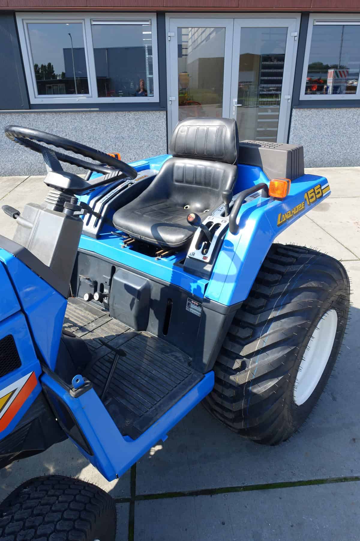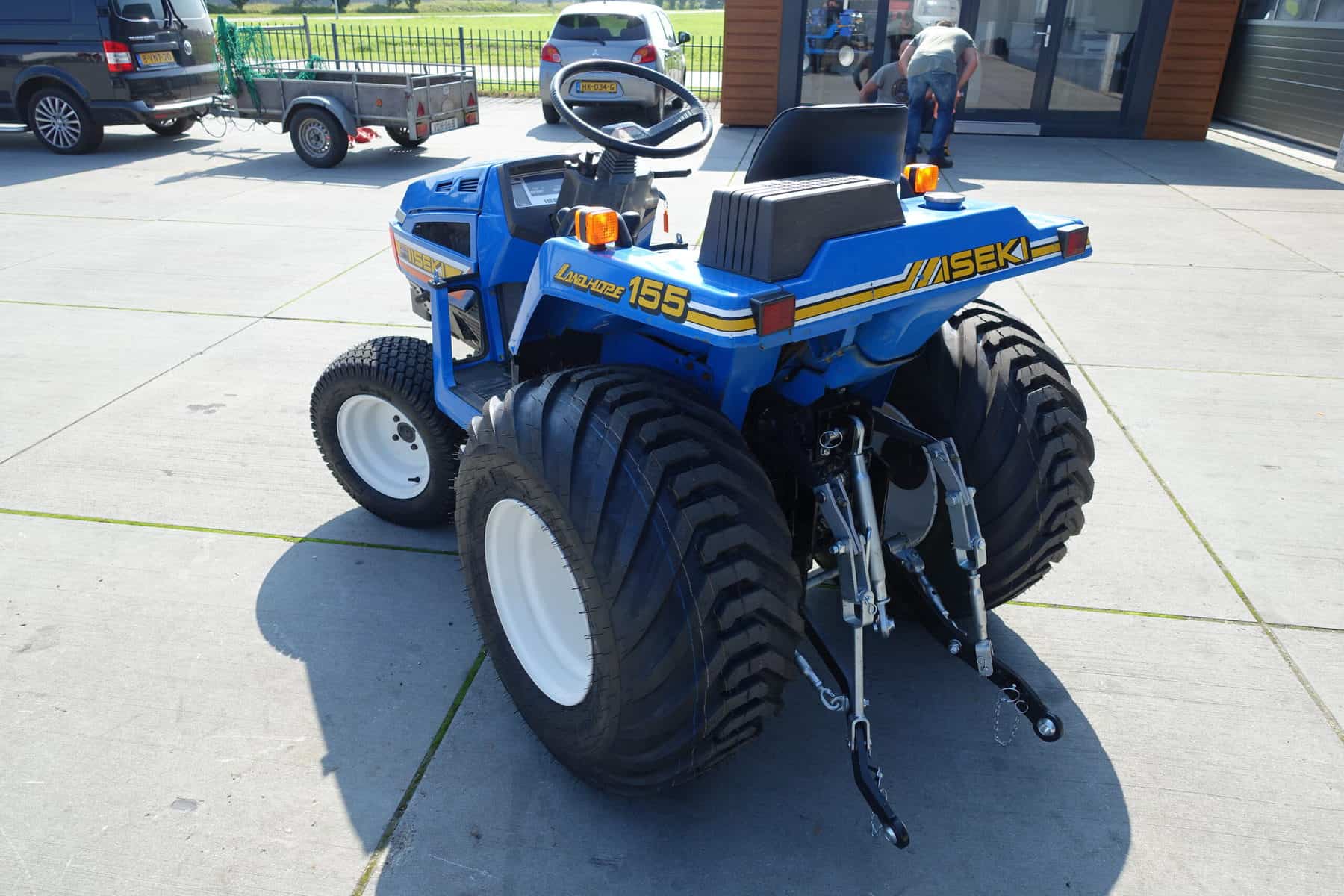 Aan de voorzijde zijn de nieuwe brede (afgeronde) grasbanden gemonteerd op de nieuwe velgen. Nauwelijks insporing, geen snijranden in de bochten en toch (waar nodig) inzetbaar als 4wd band. Tevens hebben we deze brede band ook met een (laag) V-profiel. Dit geeft geen meerprijs. Deze prachtige set banden zijn gemonteerd op een 18 Pk sterke Iseki TU155 4wd. 3 cilinder dieselmotor, hef en aftakas aan de achterzijde, geheel klaargemaakt en klaar voor gebruik. Supernette en goede trekker, geleverd met garantie.