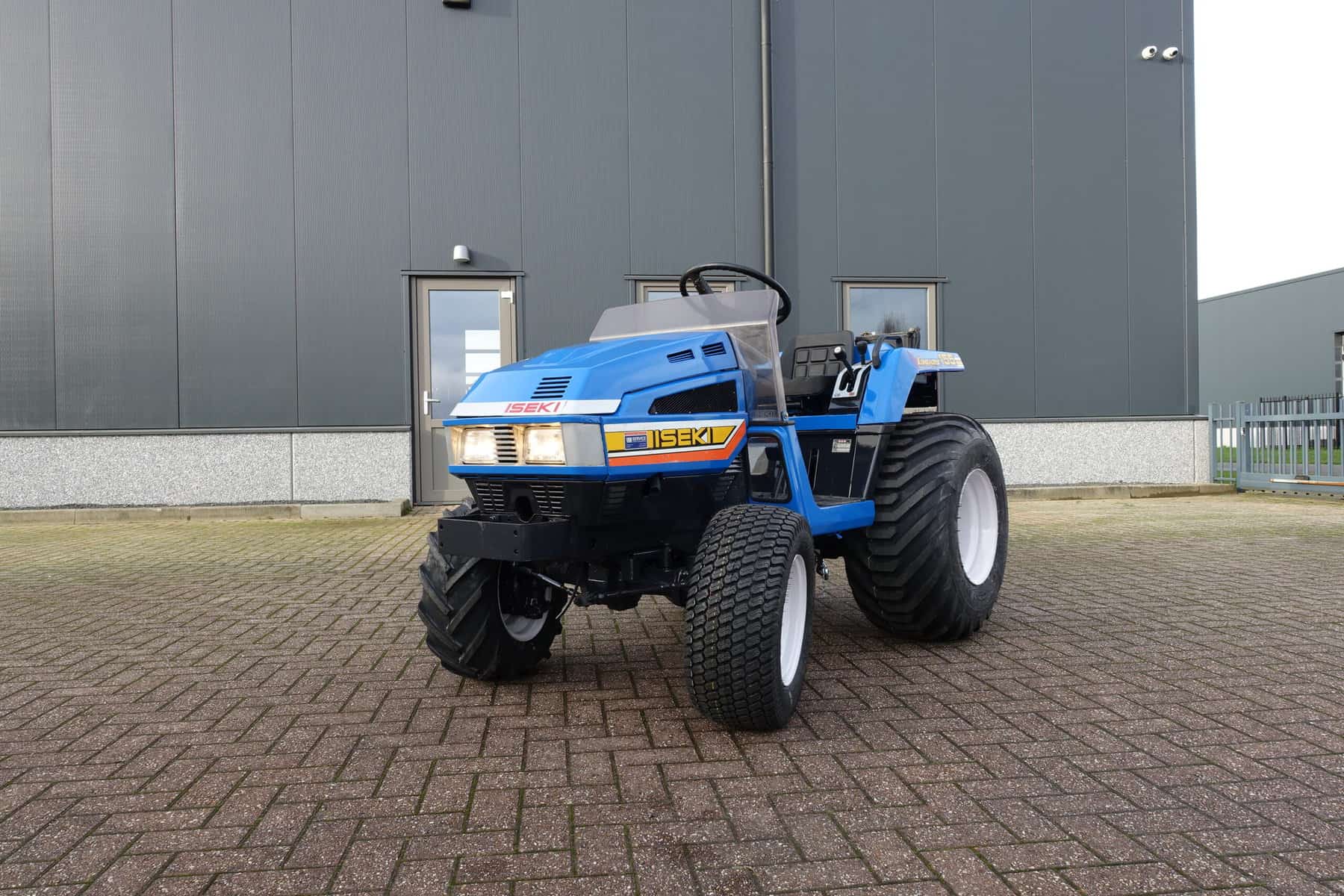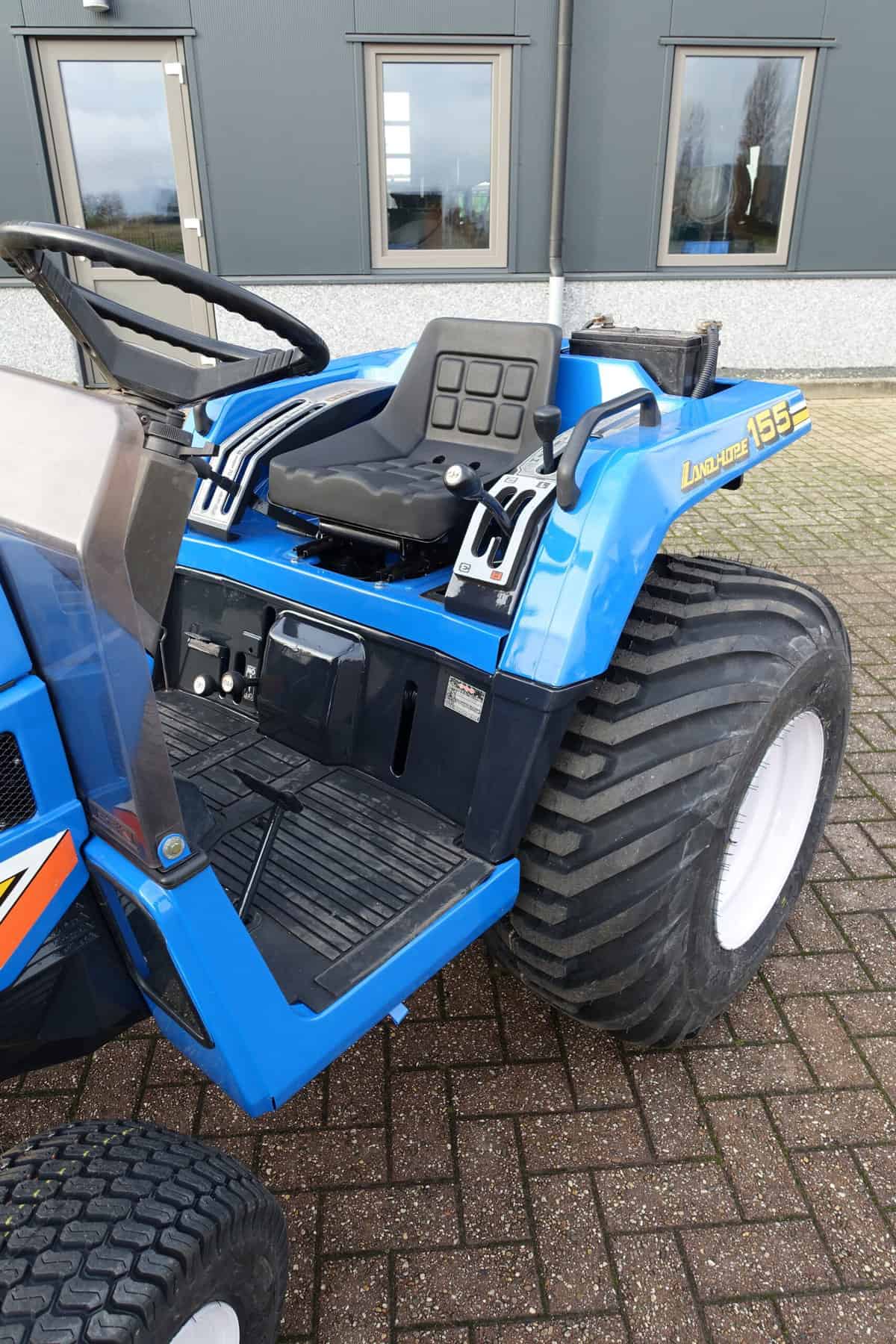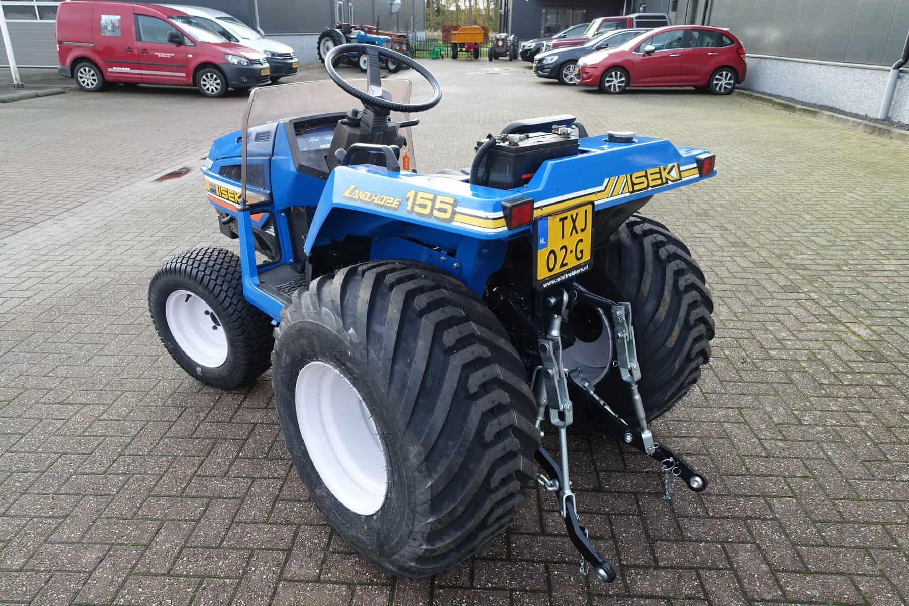 Aan de voorzijde zijn de nieuwe brede (afgeronde) grasband (rechts) gemonteerd op de nieuwe velgen. Nauwelijks insporing, geen snijranden in de bochten en toch (waar nodig) inzetbaar als 4wd band. Tevens hebben we deze brede band ook met een (laag) V-profiel (links). Dit geeft geen meerprijs. Deze prachtige set banden zijn gemonteerd op een 18 Pk sterke Iseki TU155 4wd. 3 cilinder dieselmotor, ZIJSCHAKELING, hef en aftakas aan de achterzijde, geheel klaargemaakt en klaar voor gebruik. Supernette en goede trekker, geleverd met garantie.