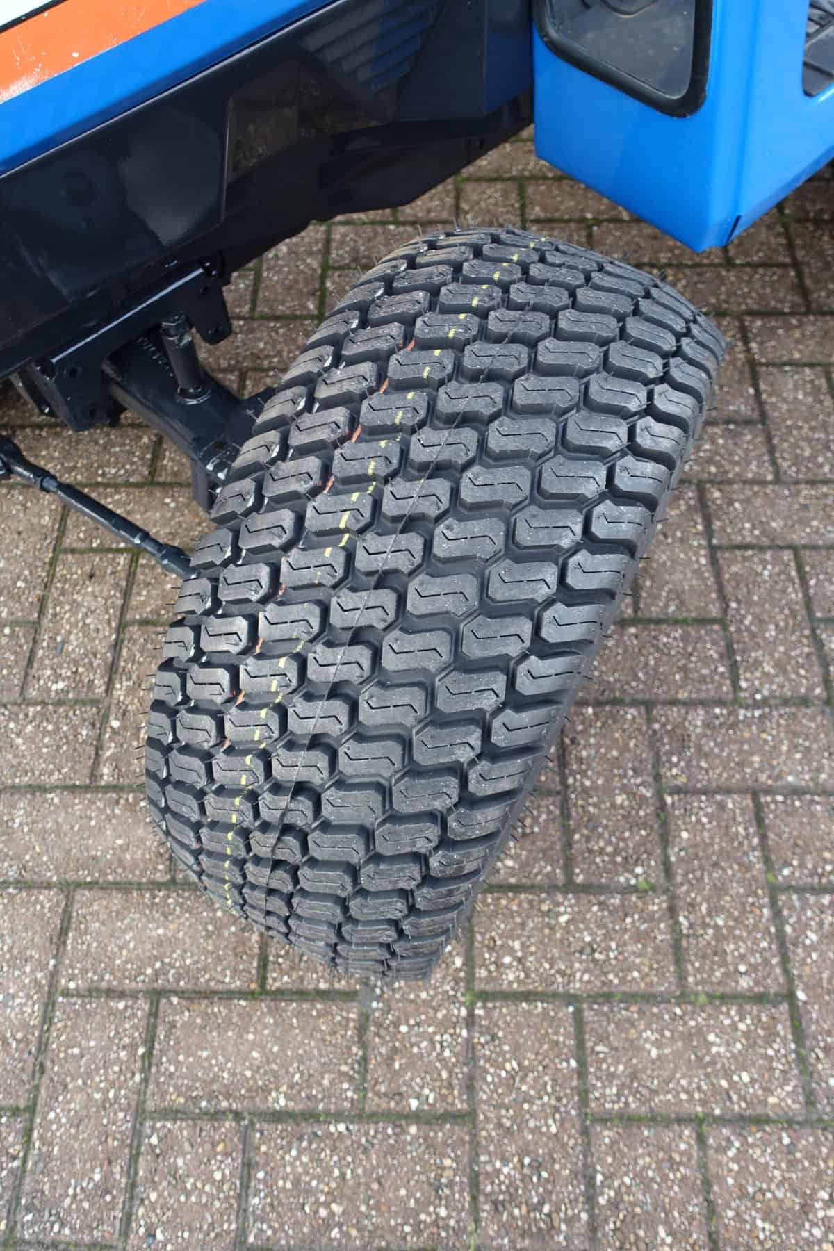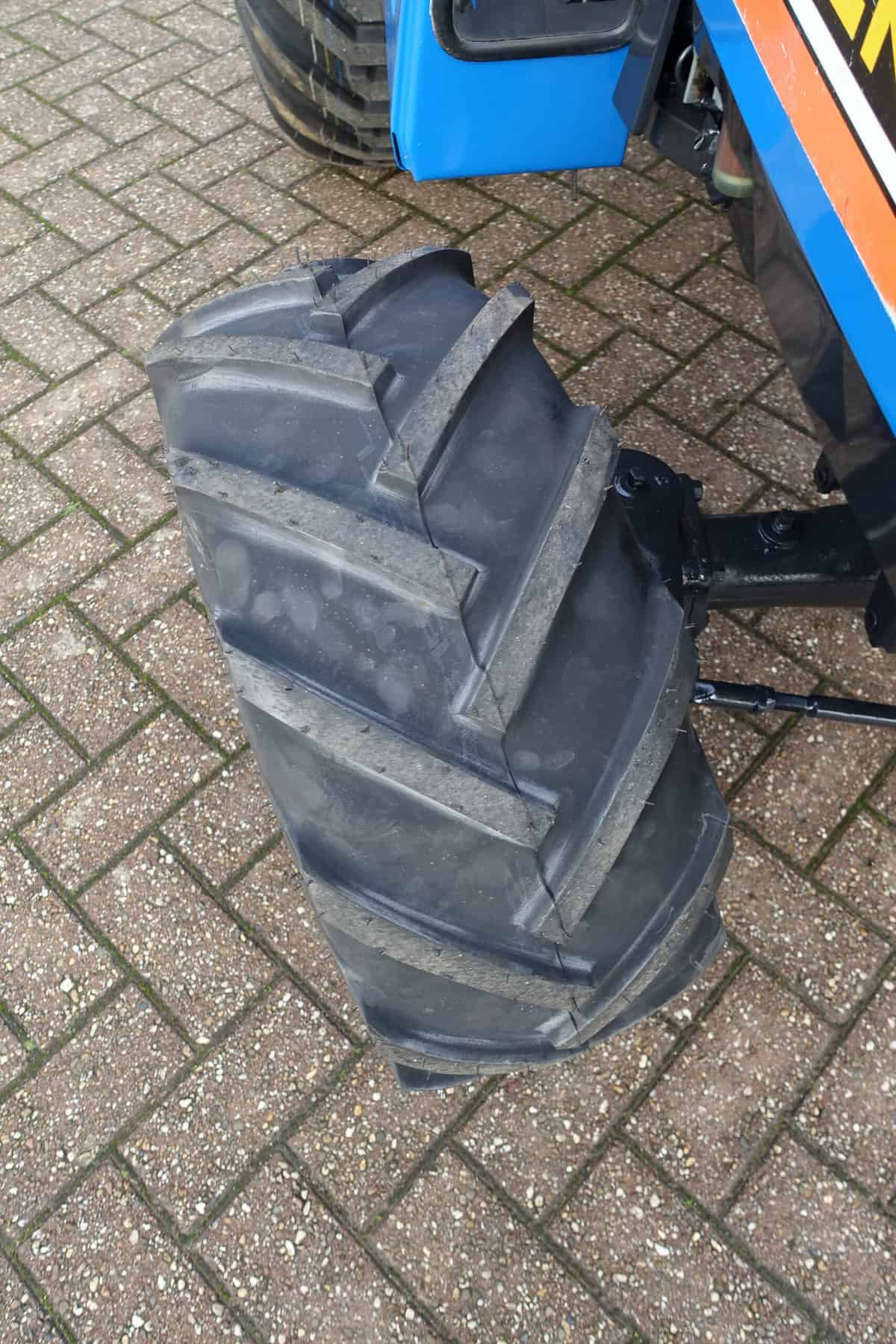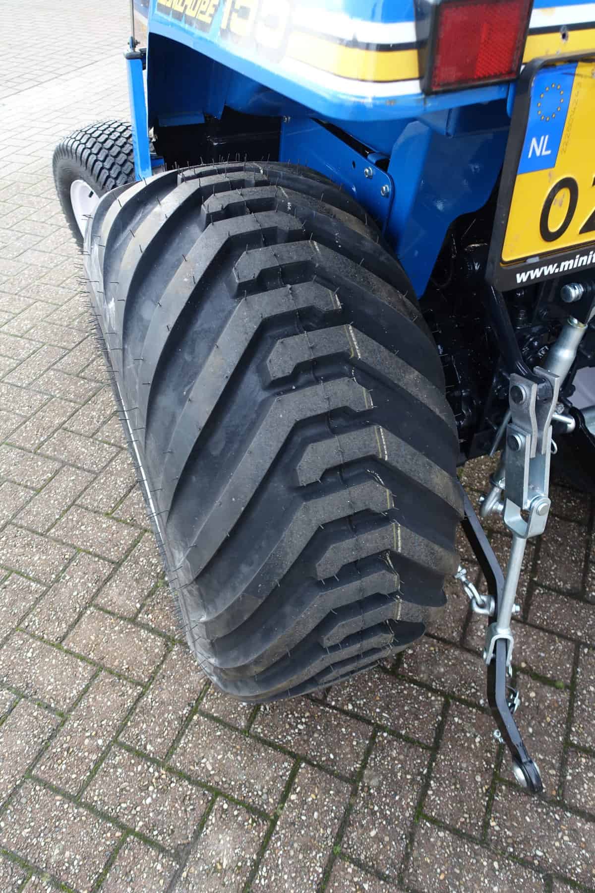 Aan de achterzijde voorzien van nieuwe velgen en nieuwe tractiebanden, mooie afgeronde nok waardoor een afgeronde band ontstaat, hierdoor snijdt de band minimaal in de ondergrond zodat je nauwelijks ziet waar je hebt gereden. Door de open nokken behoudt deze band toch de goede tractie. Door de breedte van de band wordt de druk goed verdeeld en is er nauwelijks insporing. Een ideale combinatieband dus, weinig insporing en toch goede tractie!