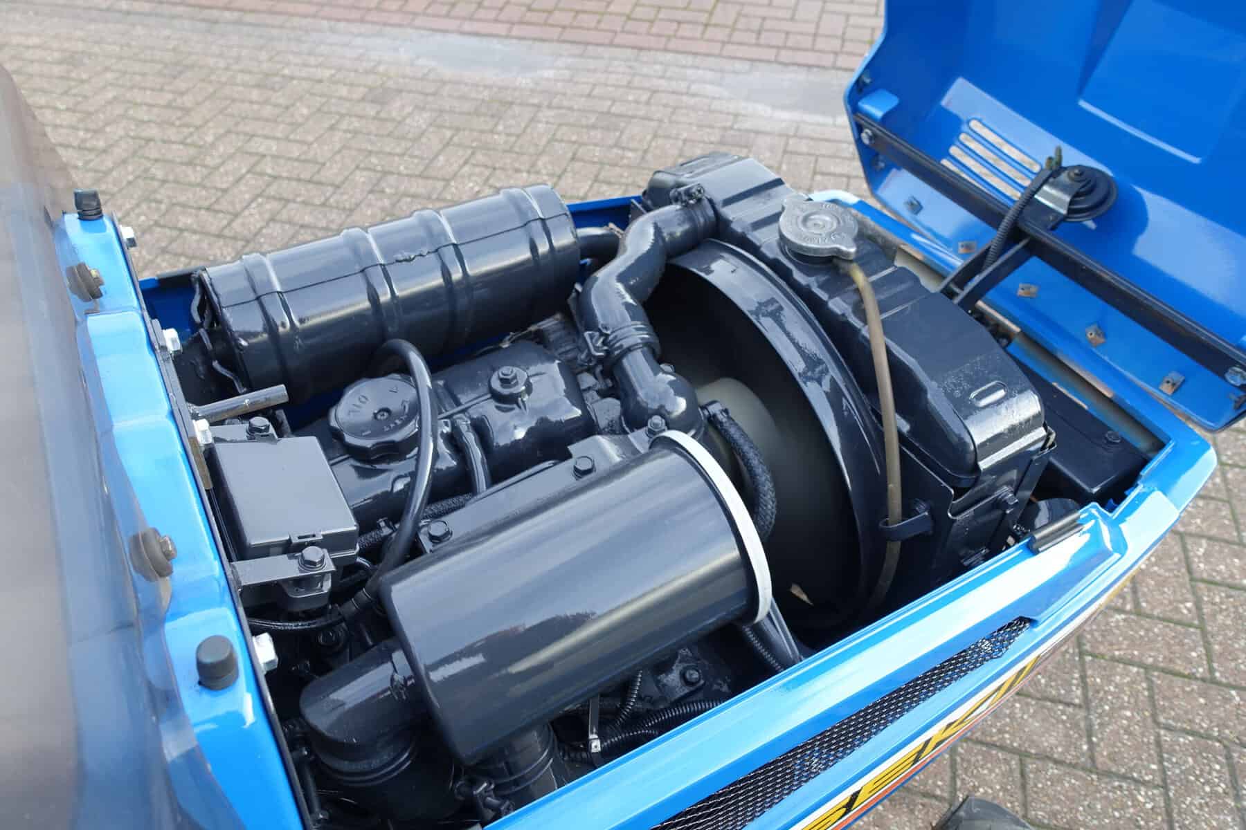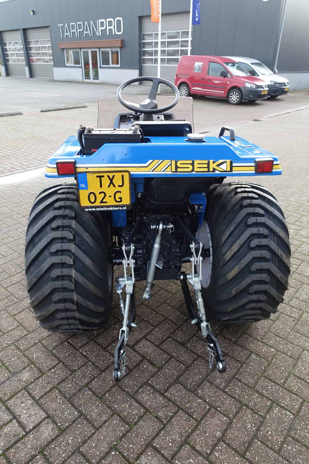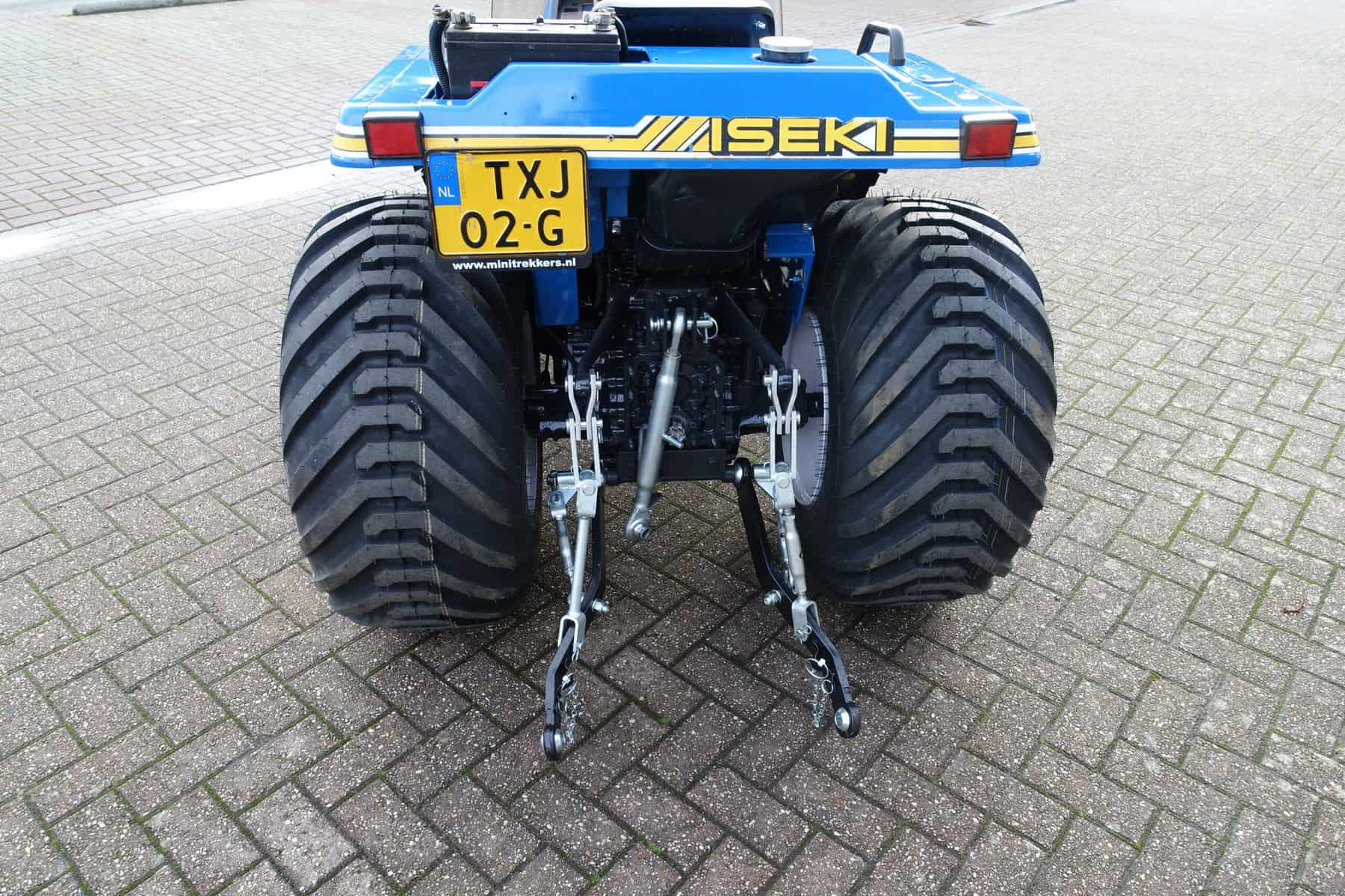 Aan de achterzijde voorzien van nieuwe velgen en nieuwe tractiebanden, mooie afgeronde nok waardoor een afgeronde band ontstaat, hierdoor snijdt de band minimaal in de ondergrond zodat je nauwelijks ziet waar je hebt gereden. Door de open nokken behoudt deze band toch de goede tractie. Door de breedte van de band wordt de druk goed verdeeld en is er nauwelijks insporing. Een ideale combinatieband dus, weinig insporing en toch goede tractie!