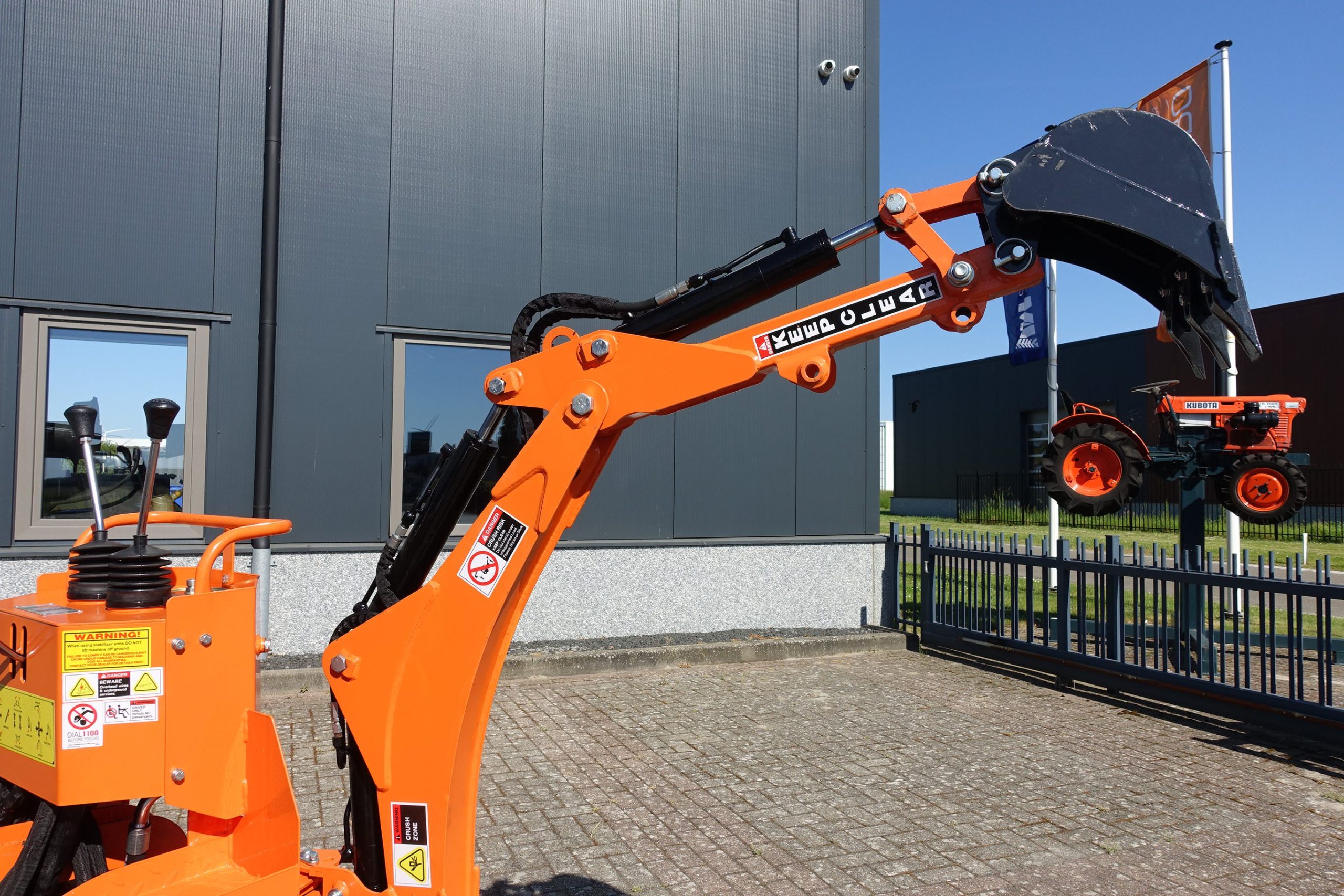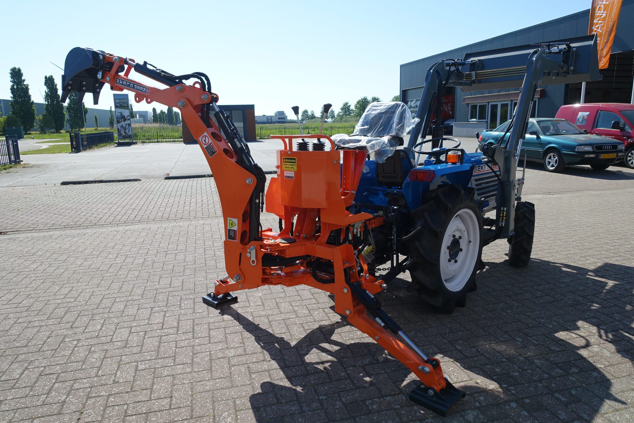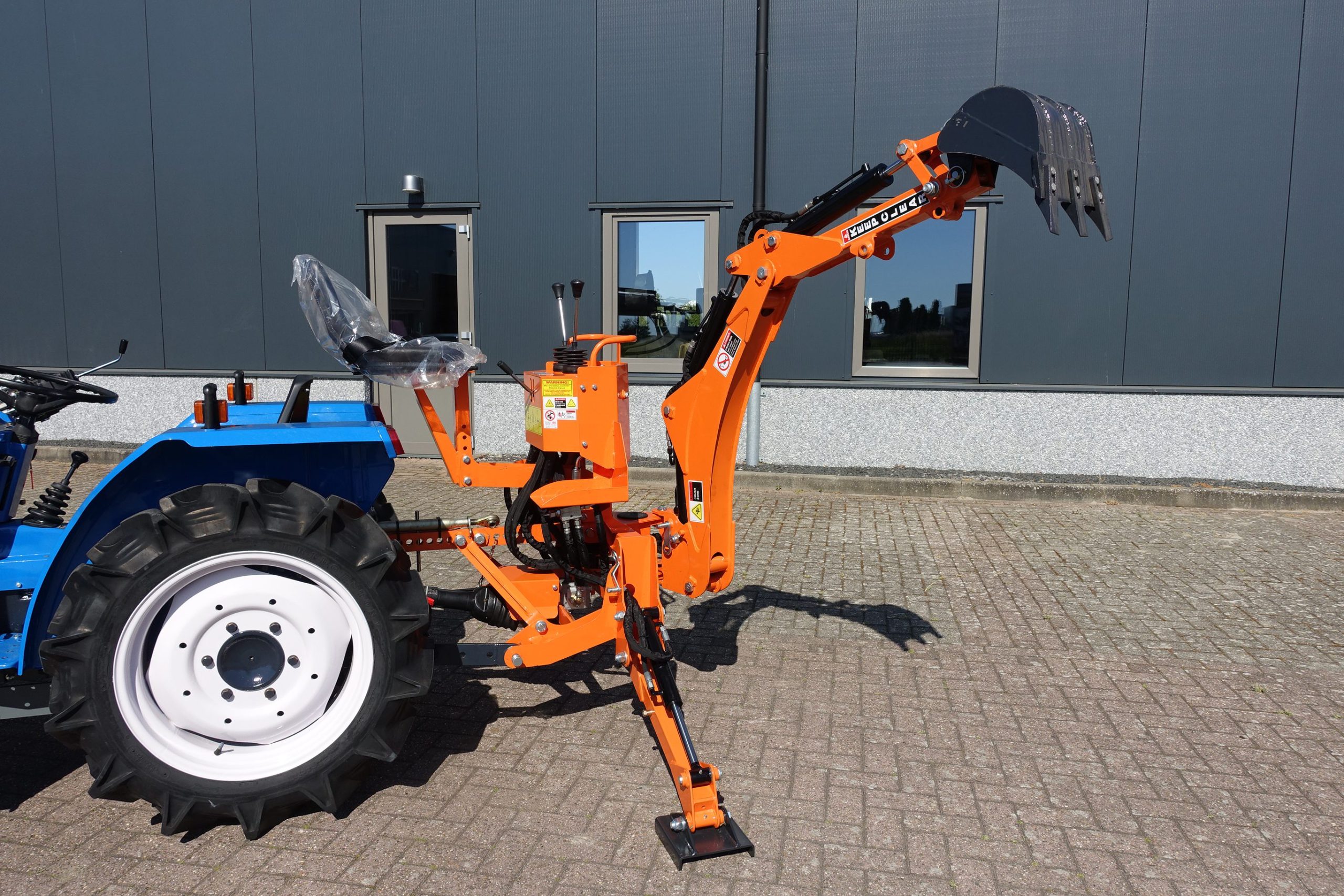 Aan de achterzijde voorzien van nieuwe Backhoeloader / Graafarm. Groot bereik en een groot hefvermogen. Geheel eigen hydraulisch systeem, aftakas aankoppelen en klaar. Kruishandlebediening (joystickbediening) De bak is voorzien van tanden om de grond ook los te kunnen maken. Tevens leverbaar met brede graafbak.