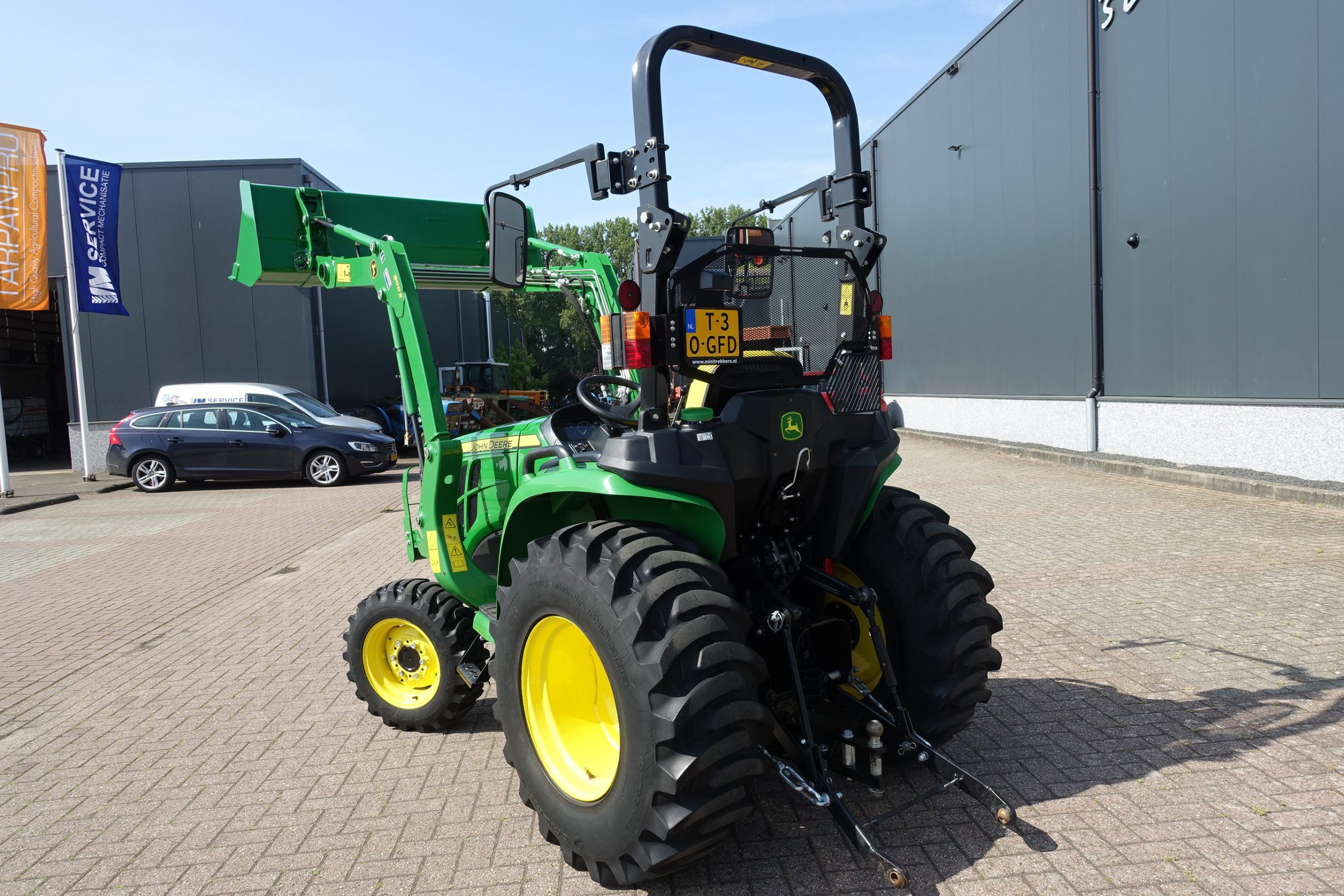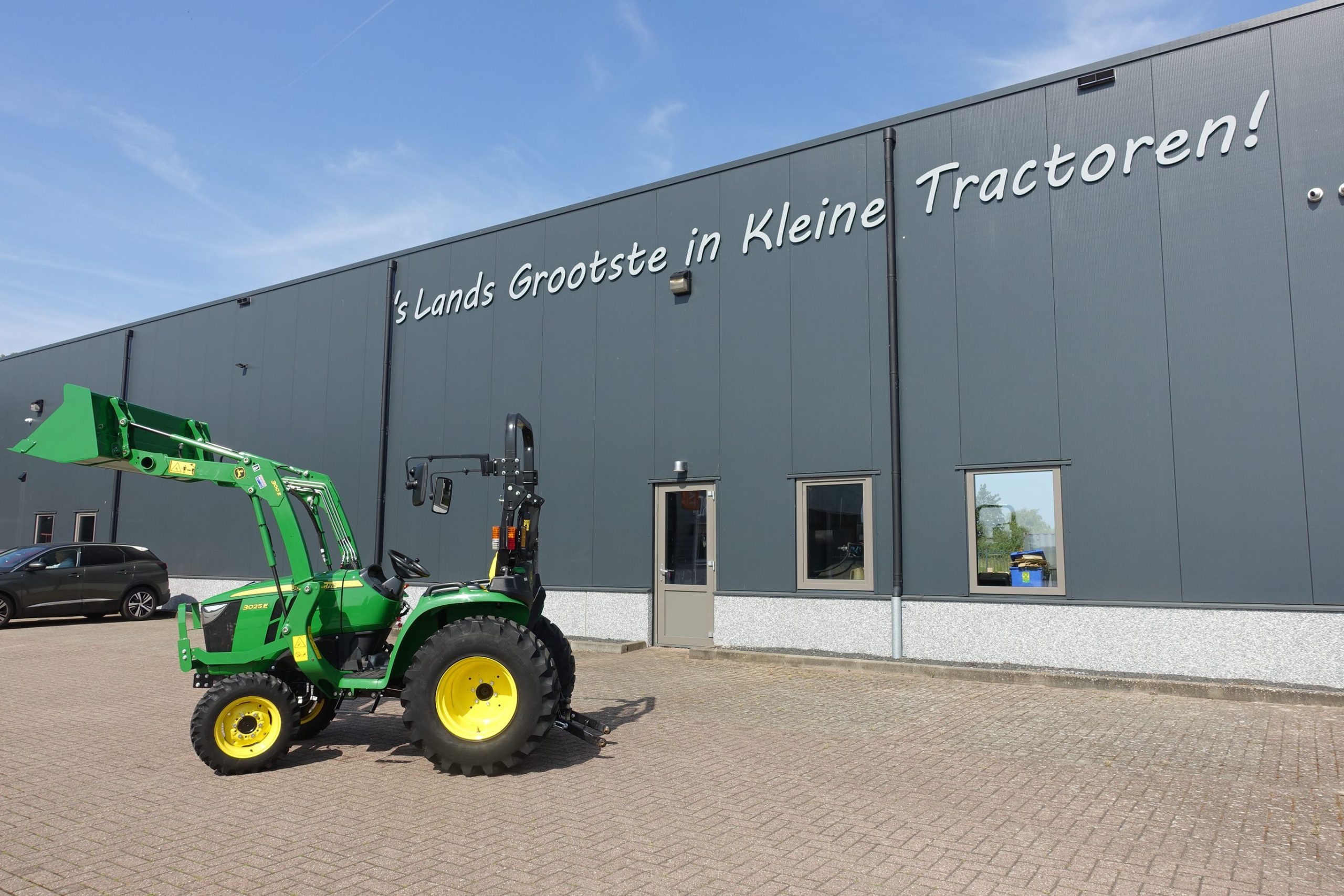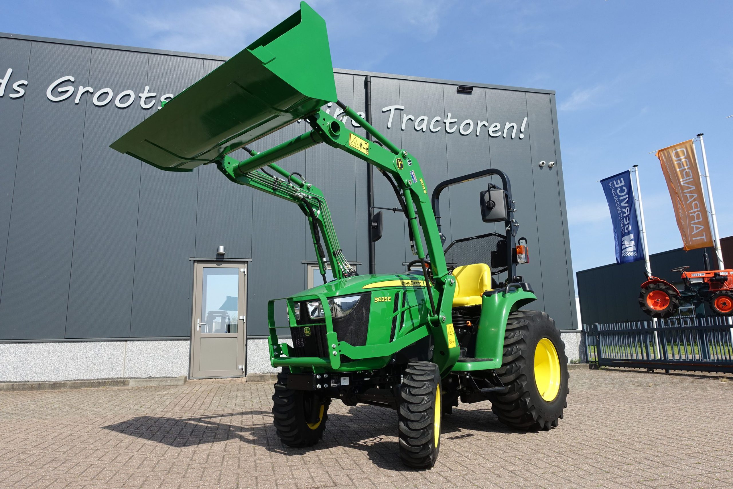 Nu in voorraad; Nagenoeg nieuwe John Deere 3025E HST compleet met luxe originele John Deere 300E voorlader!!