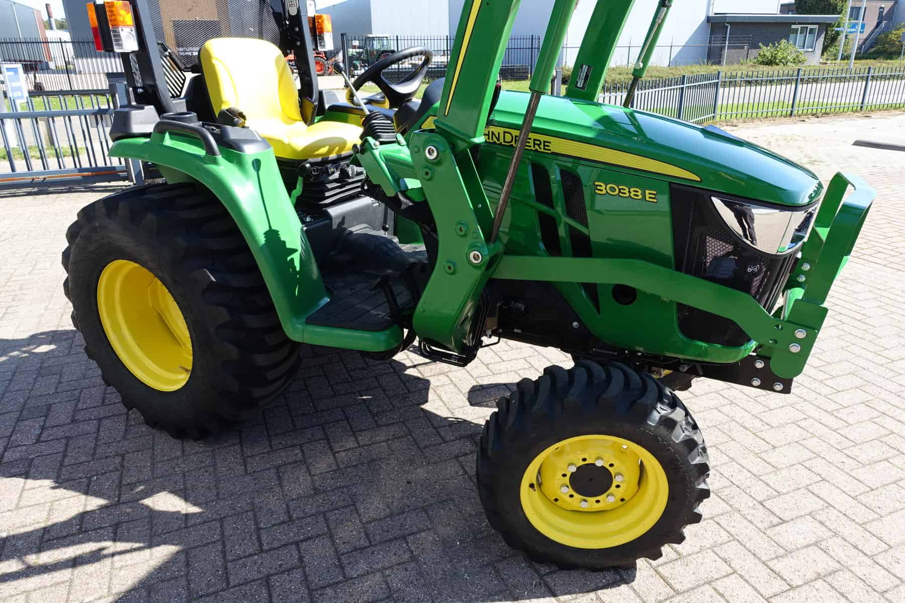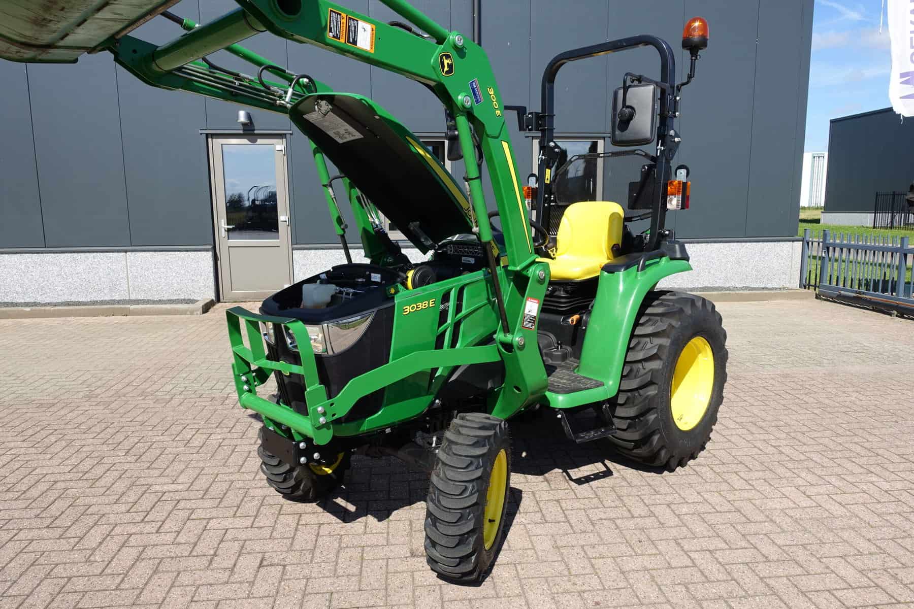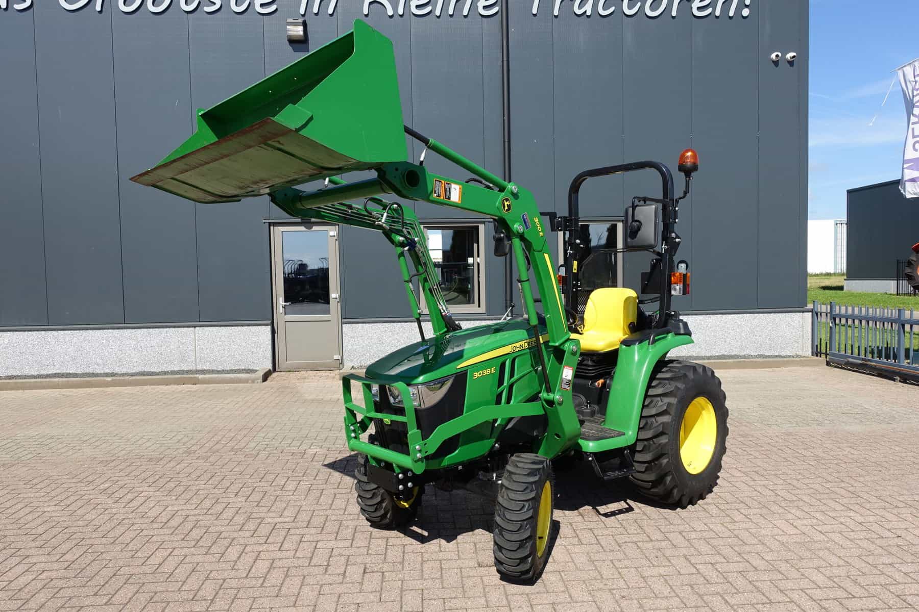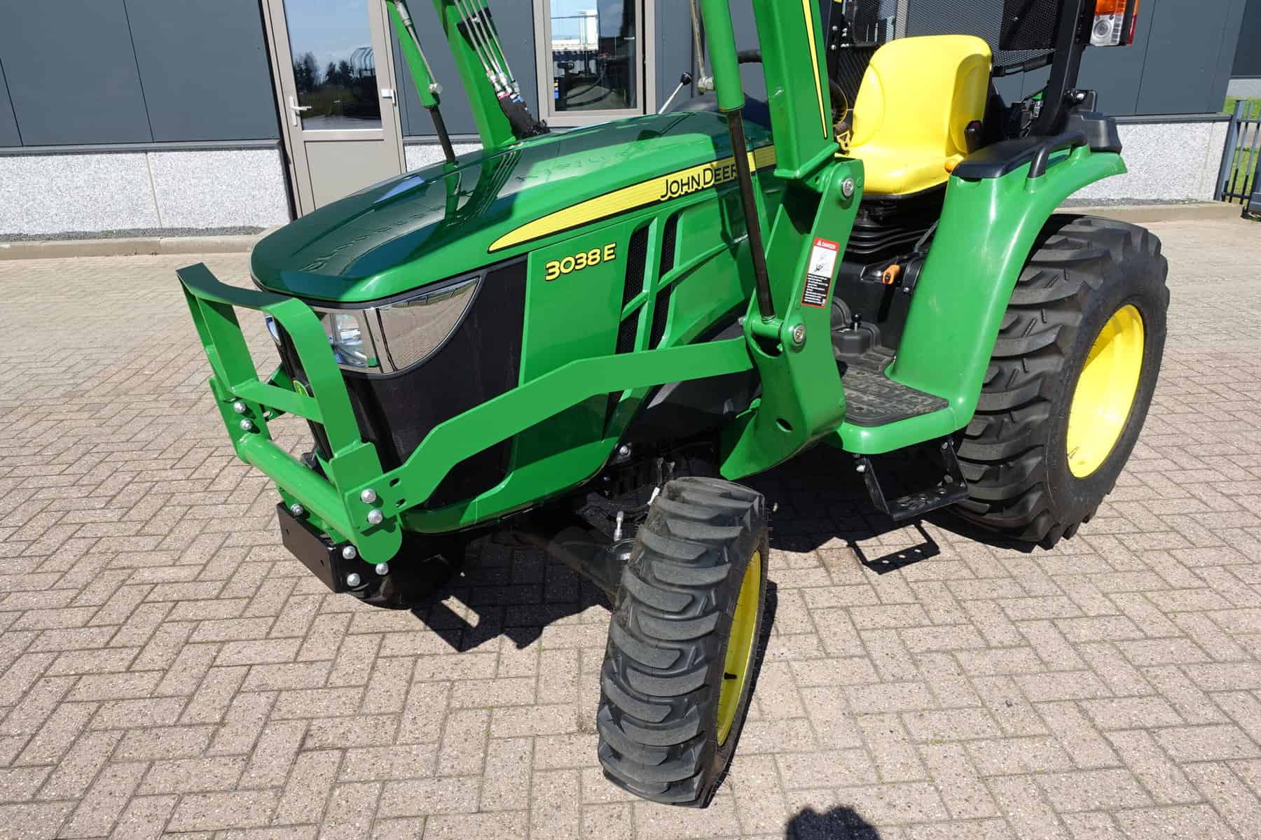 Nu in voorraad; Nagenoeg nieuwe John Deere 3038e HST compleet met voorlader.