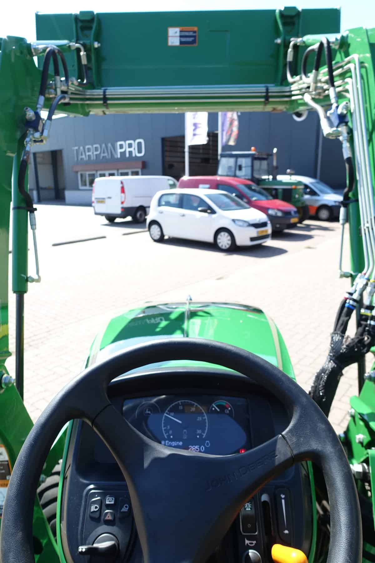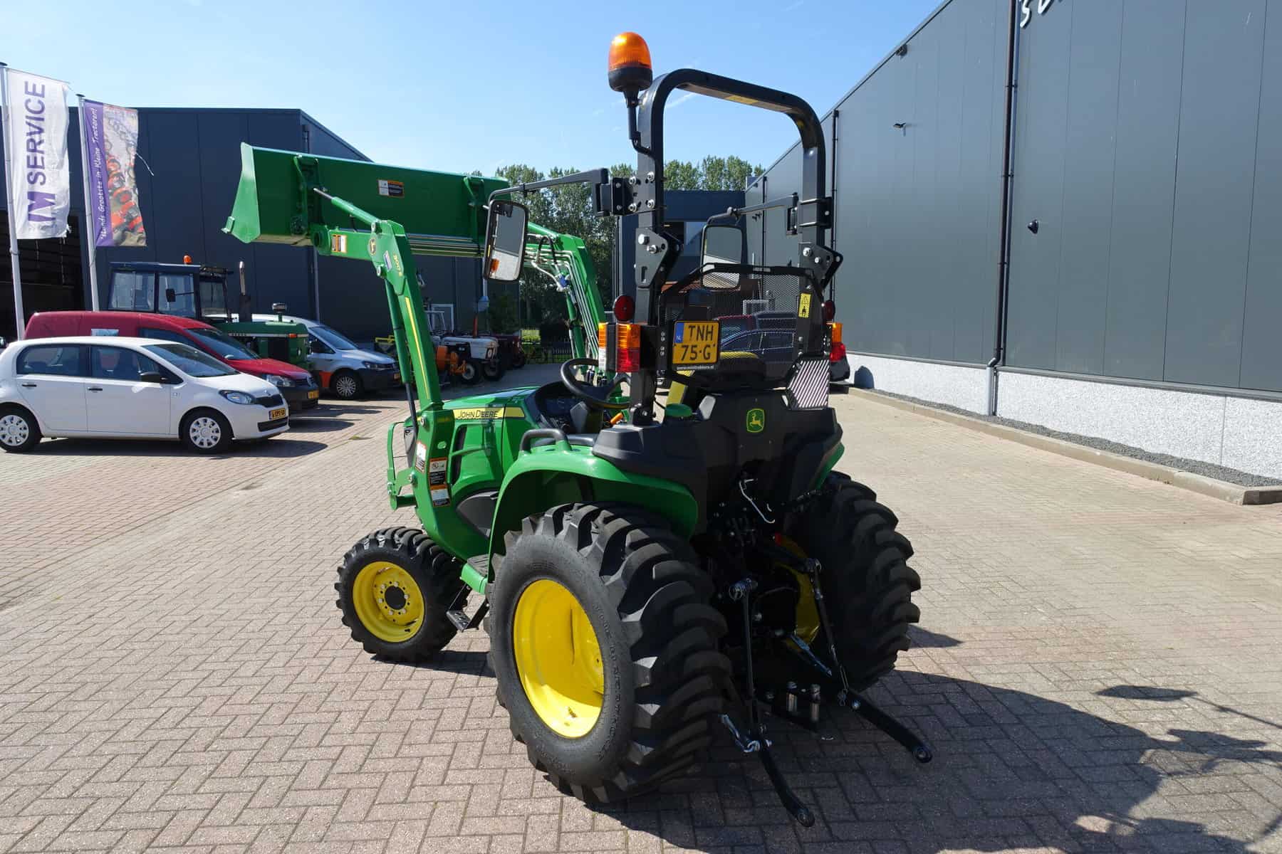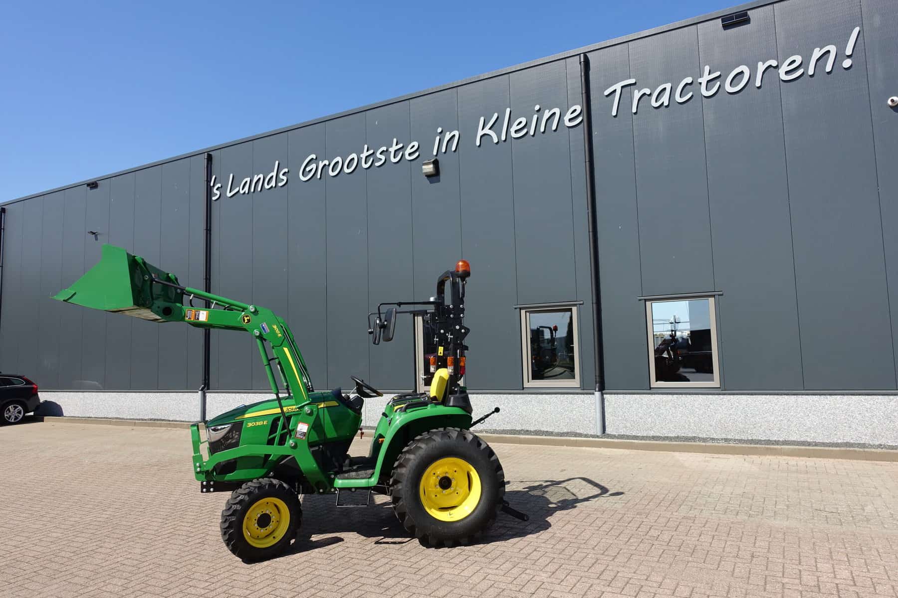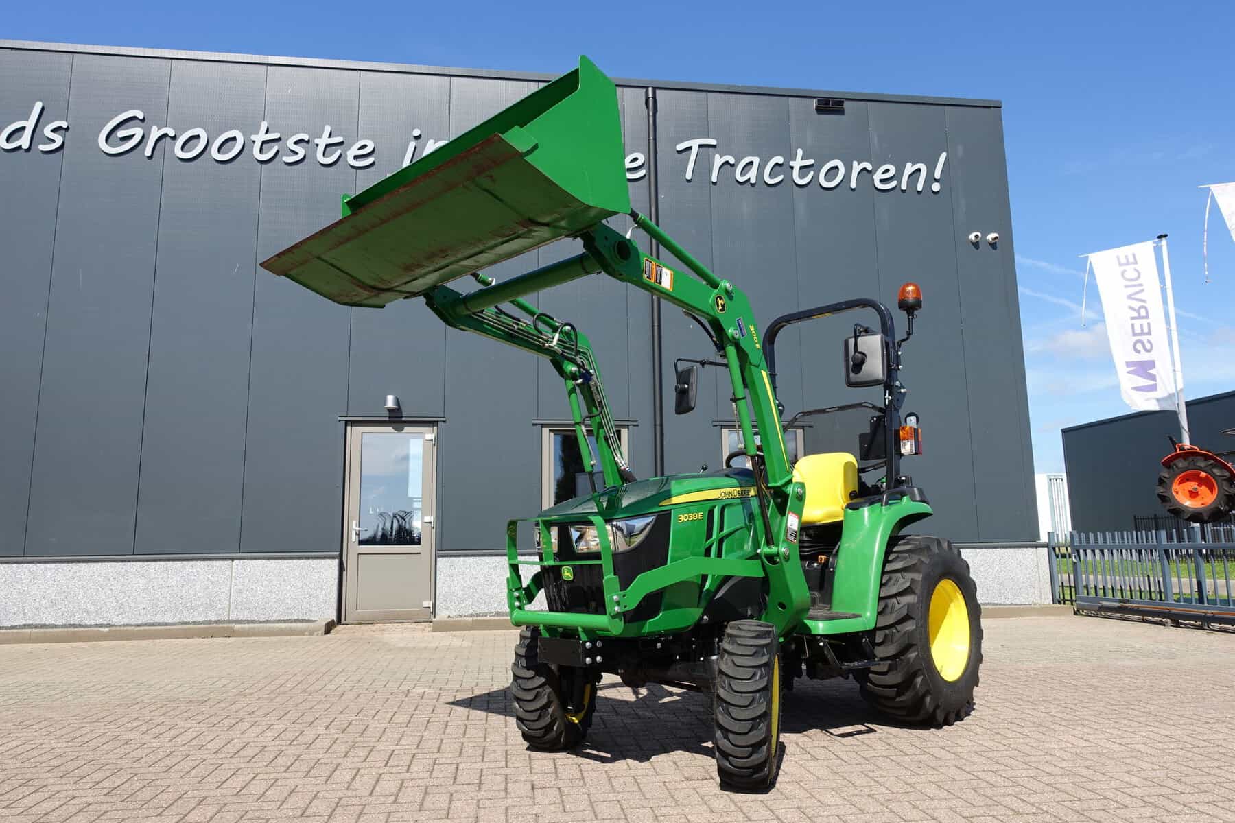 Nu in voorraad; Nagenoeg nieuwe John Deere 3038e HST compleet met voorlader.