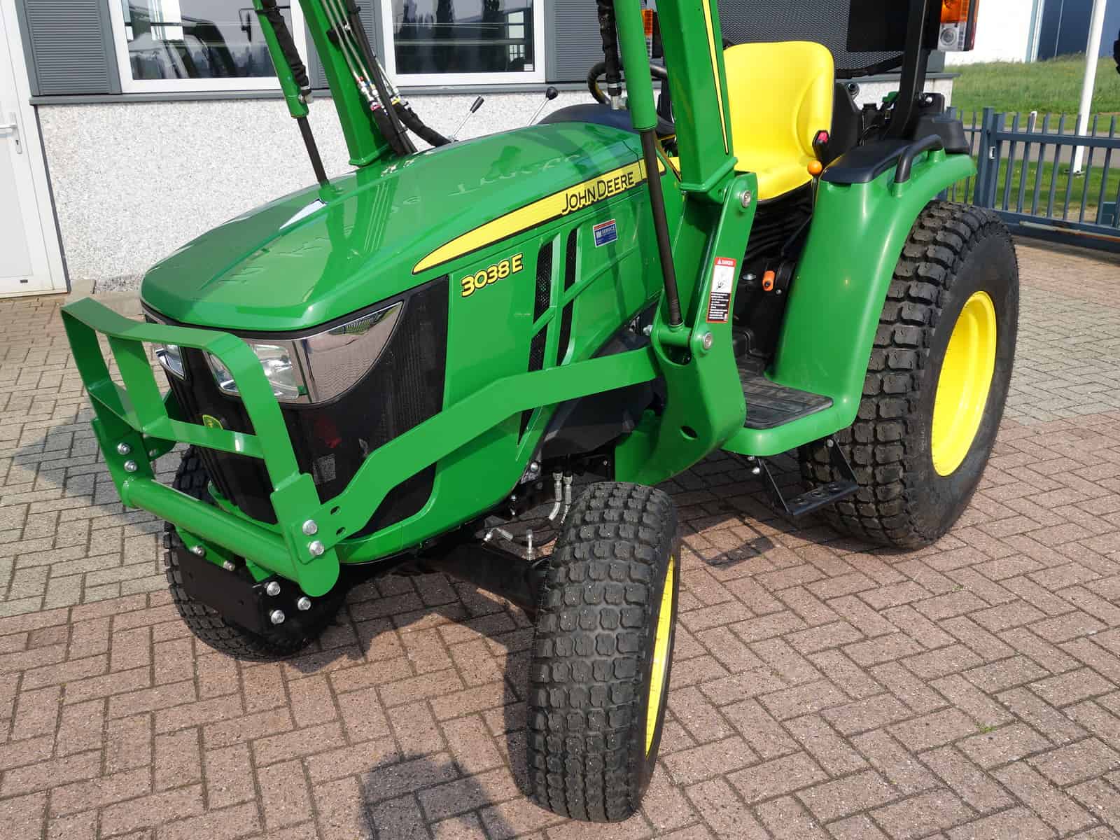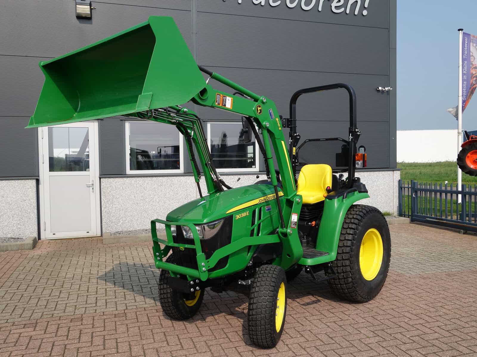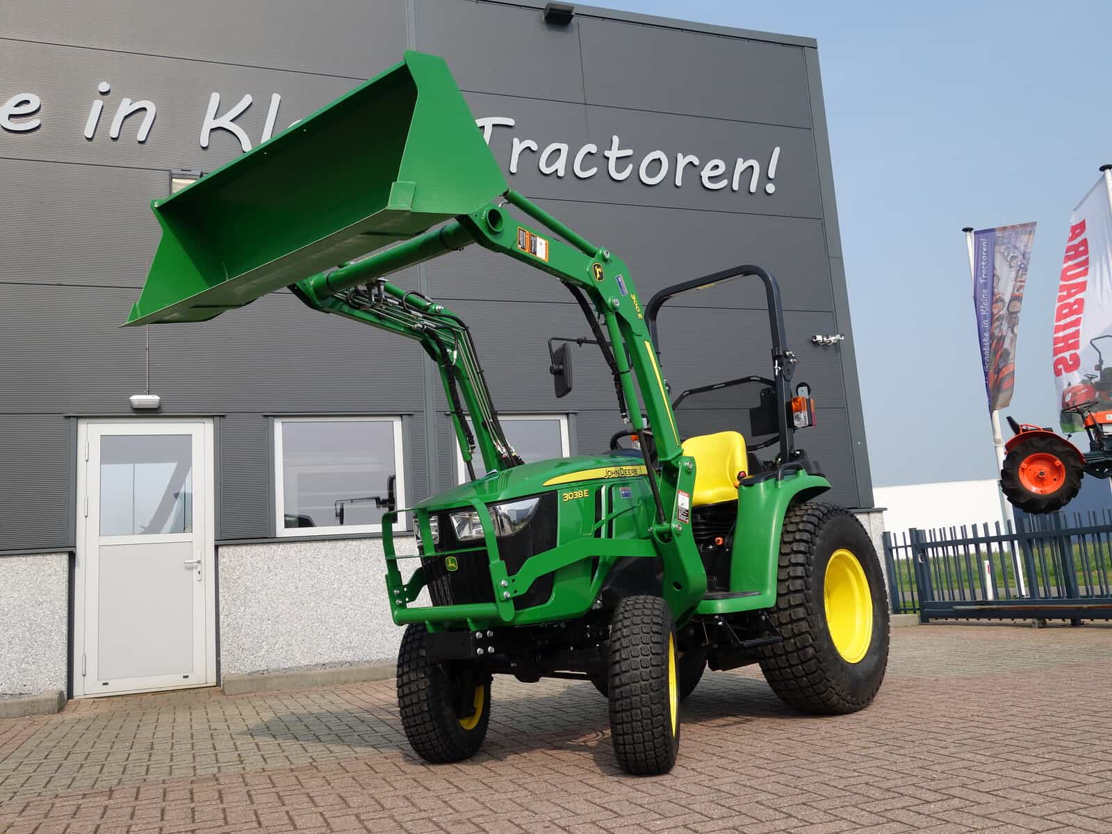 Nu in voorraad; (Nagenoeg) Nieuwe John Deere 3038e HST compleet met voorlader.