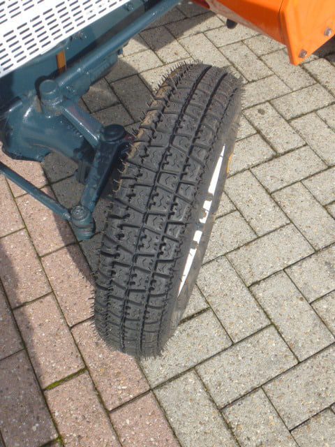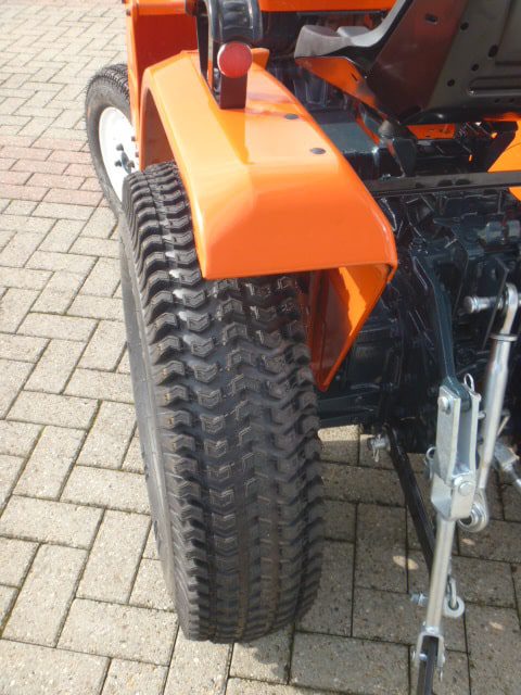 Trekker staat rondom op nieuwe gazonbanden. Ideale banden voor op het gazon, grind, zand, enz. Met deze nieuwe gazonbanden maakt de trekker geen sporen in de ondergrond. De afgeronde wangen van de band zorgen er voor dat de banden ook niet insnijden in het gazon waardoor de grasmat niet beschadigd wordt. In combinatie met de 4wd is een goede tractie nog steeds aanwezig.