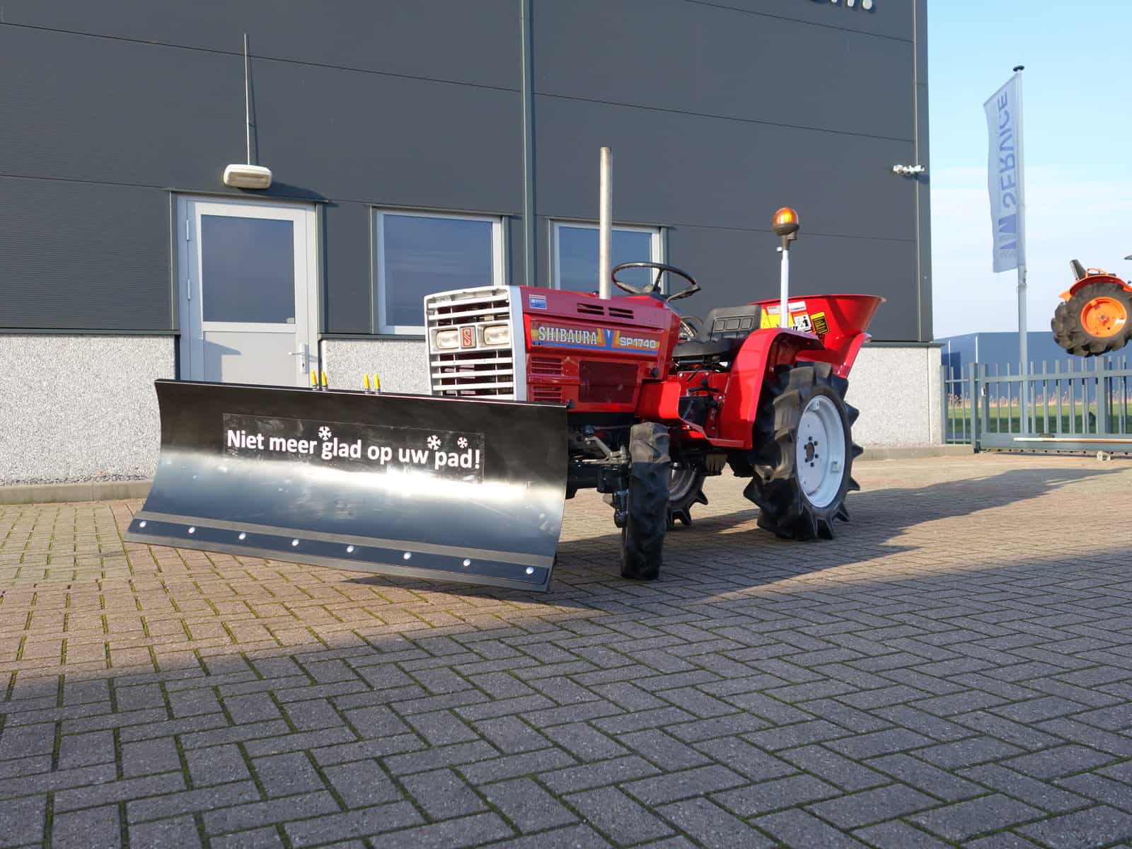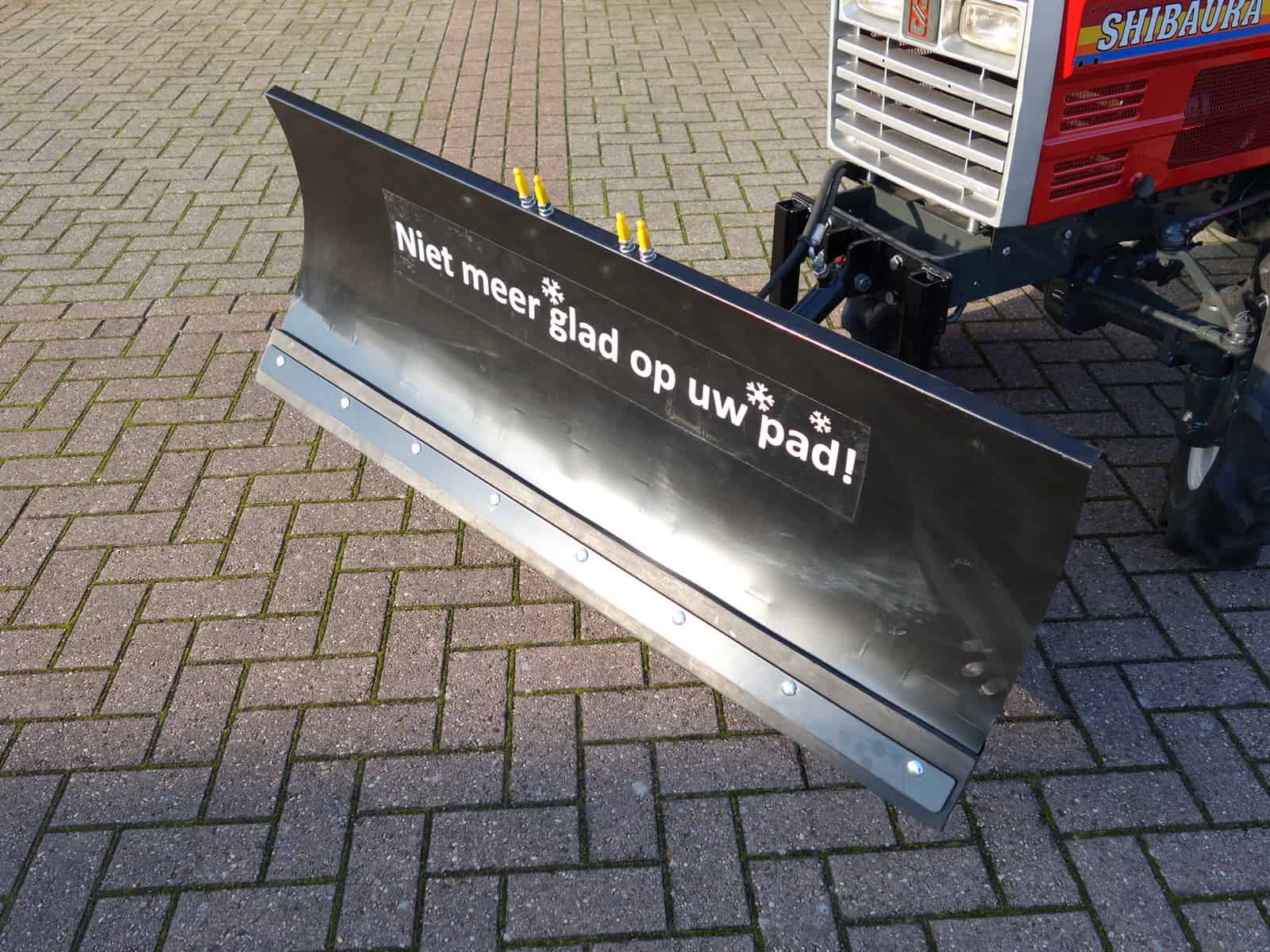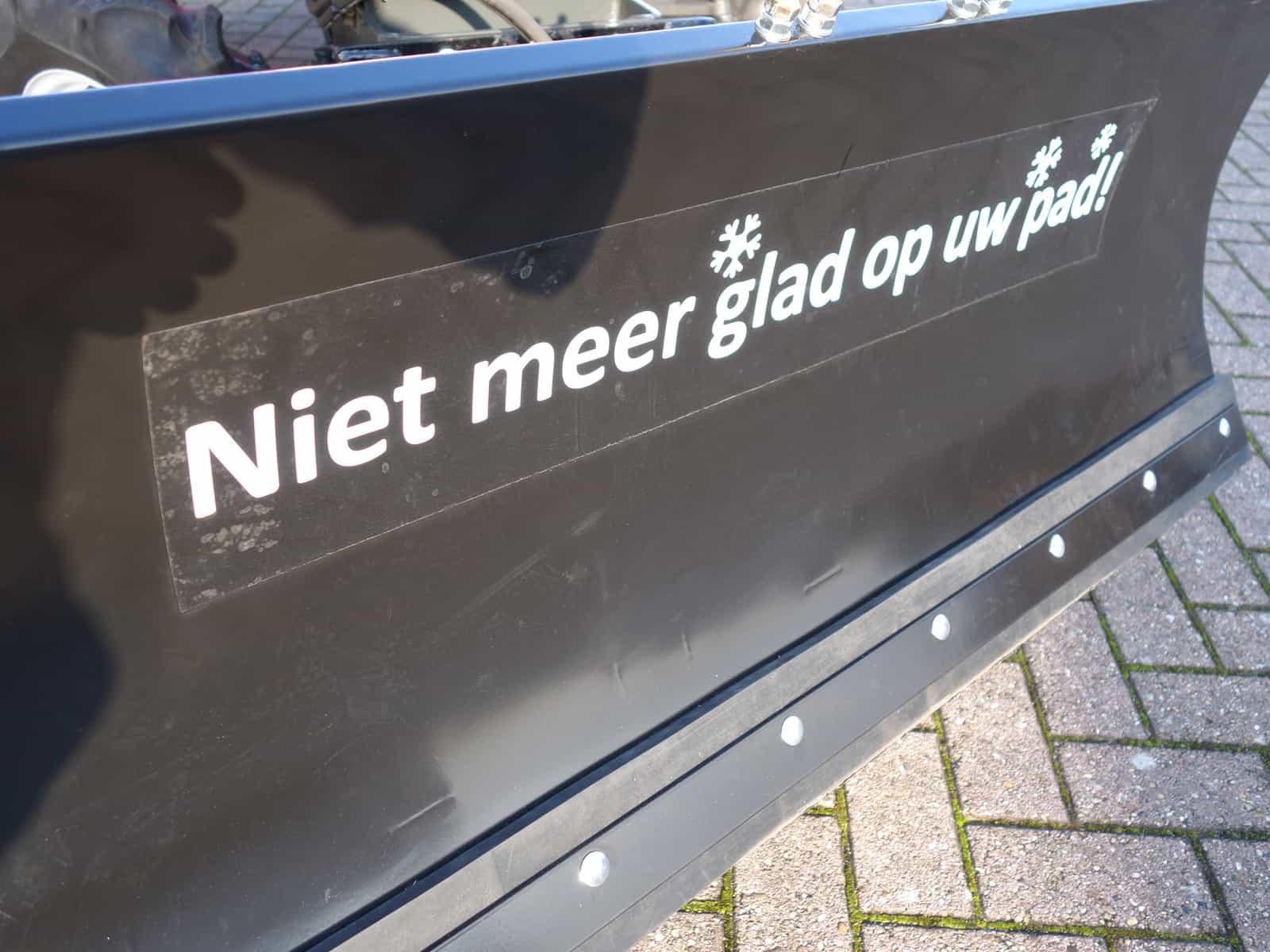 “Niet meer glad op uw pad!” Dat staat te lezen op de hydraulische frontsneeuwschuif.
