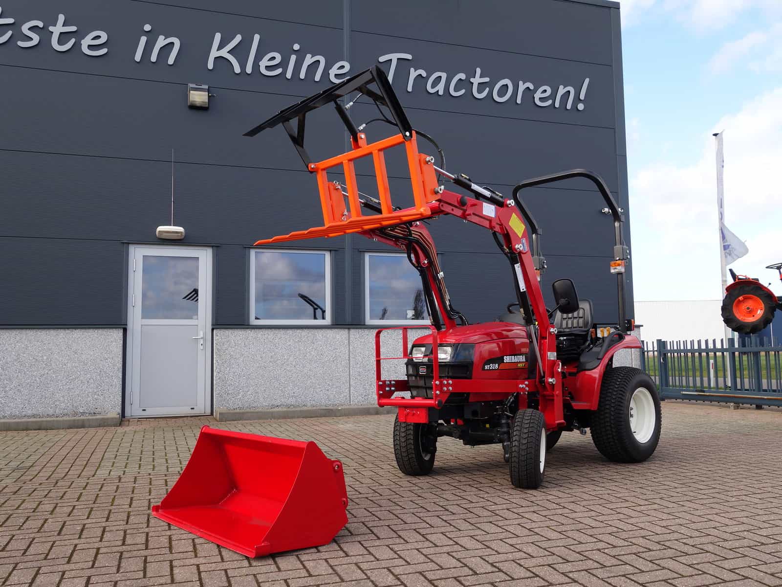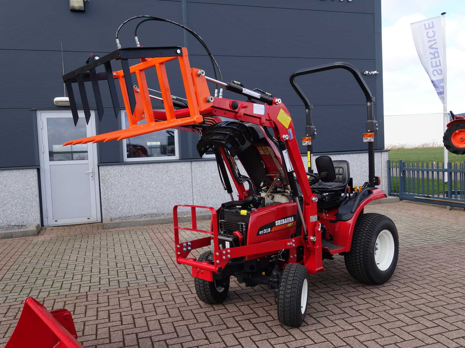 Shibaura ST318 4wd met nieuwe voorlader. Voorlader is voorzien van het snelwisselsysteem waardoor de voorlader in zijn geheel eenvoudig af te koppelen is. Externe hydraulische aansluiting op de voorlader met snelkoppelingen. Compleet met hydraulische mestklem en dichte bak.