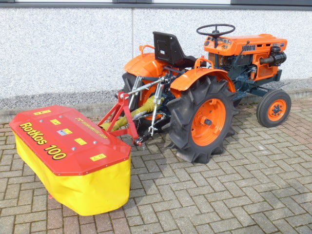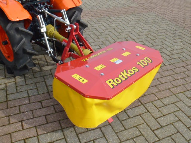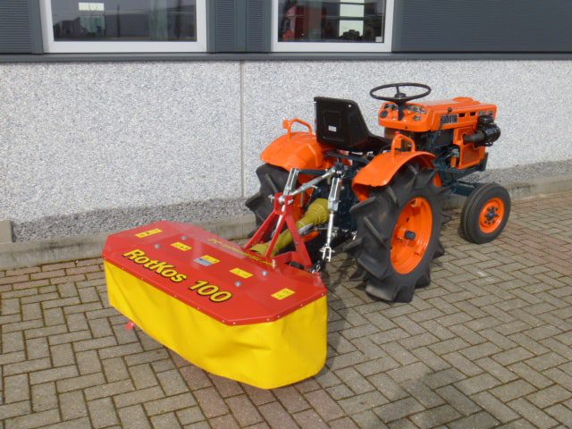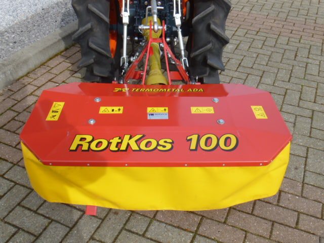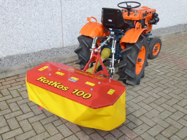 Speciaal ontwikkeld voor de compacttractoren en minitrekkers; De Rotkos 100 cyclomaaier. Door de speciale en compacte bouw perfect toe te passen achter nagenoeg iedere minitrekker. De doordachte en robuuste constructie maakt dat de machine zich in het geheel onderscheid van de diversiteit aan merken. De complete aandrijflijn draait geheel in een oliebad en dat alles zonder v-snaren en met een ingebouwde vrijloopkoppeling. Hierdoor is een constante en langdurige aandrijving gegarandeerd. Mooie solide trommels met een grote tussenruimte waardoor het gewas goed (en met weinig kracht) tussen de trommels door getransporteerd wordt. De Rotkos cyclomaaiers zijn leverbaar in de 100 en 135cm brede uitvoering en worden geleverd compleet met aftakas. Kijk en vergelijk, geen van de cyclomaaiers is zo compleet en degelijk gebouwd als de Rotkos 100. Gegarandeerde machine voor een scherpe prijs!